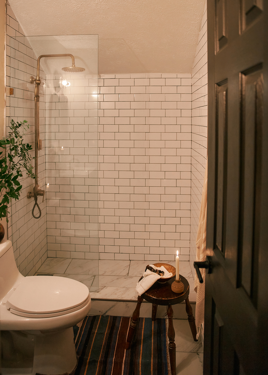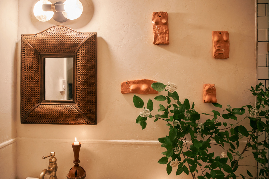 სააბაზანოში გამორჩეული ესთეტიკა ვინტაჟური ელემენტებით, ოქროსფერი დეტალებითა და კედლის სკულპტურით მიიღწევა, რომელიც გიორგი დოლიძეს ეკუთვნის. ხაკისფერი და ლურჯი ტონალობა, გალესილი კედლები და გამწვანება ბუნებრივ, მარტივ დიზაინს ქმნის და ამაღლებული განწყობა შემოაქვს სივრცეში.