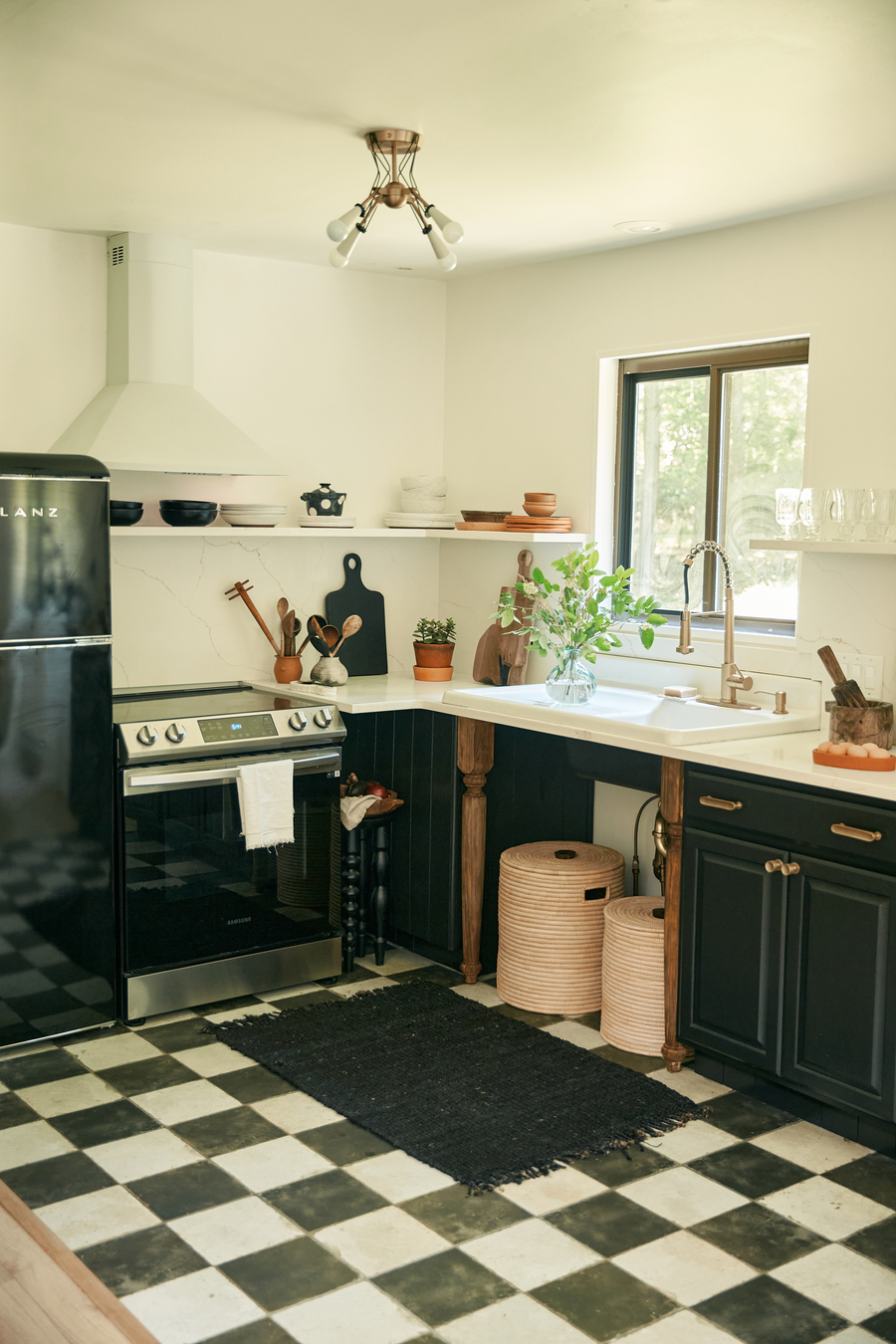 სახლს გამორჩეულ ელფერს სამზარეულოს ზონა ანიჭებს, სადაც მუქი ფერებისა და თეთრი ტონალობის საინტერესო კონტრასტი იჩენს თავს. სამზარეულოში თუჯის ანტიკვარული ავეჯია გამოყენებული, ნიჟარა კი ძველი, 1900-იანი წლების ფერმის სახლიდანაა წამოღებული და განახლებული. იატაკზე შავ-თეთრი ტერაკოტას ფილებია დაგებული, რაც ოთახს ელეგანტურობასა და დახვეწილობას სძენს.