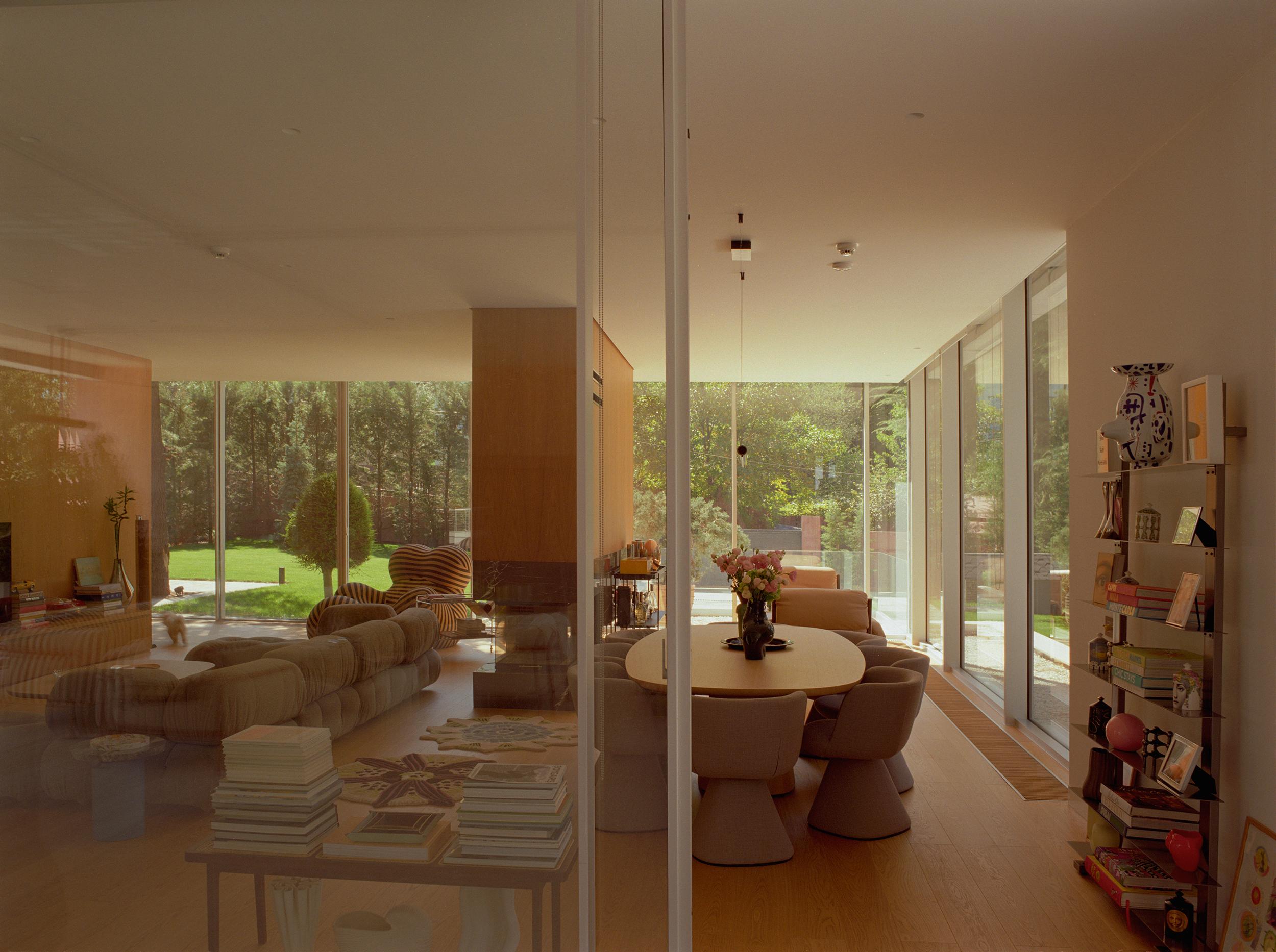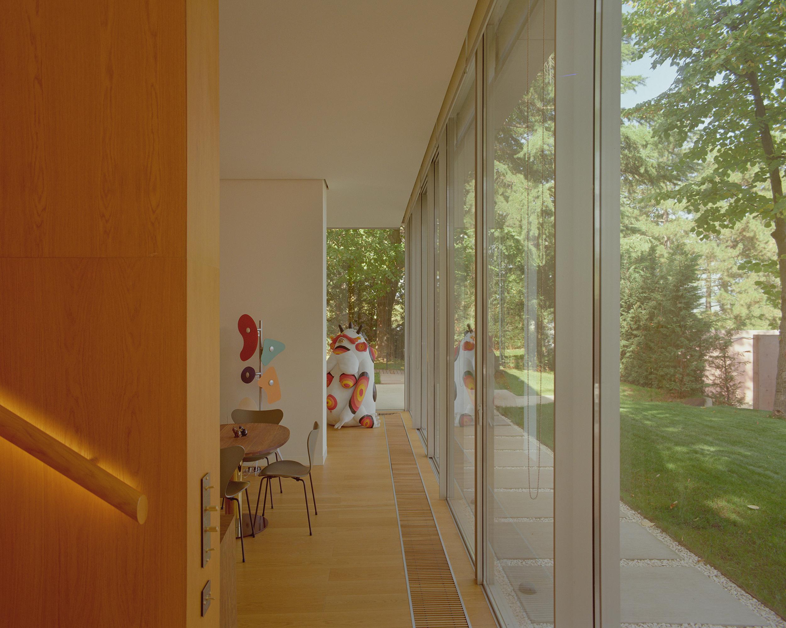 გეგმარების პრინციპი ეფუძნება გახსნილობასა და გარემოსთან მაქსიმალურ კავშირს. პირველ სართულზე განლაგებული საერთო ზონა — მისაღები, სასადილო და სამზარეულო — გადის გამჭოლი ვიზუალური ღერძებით ეზოსა და ლანდშაფტის მიმართულებით, რაც ინტერიერსა და ექსტერიერს შორის საზღვარს თითქმის უხილავს ხდის.