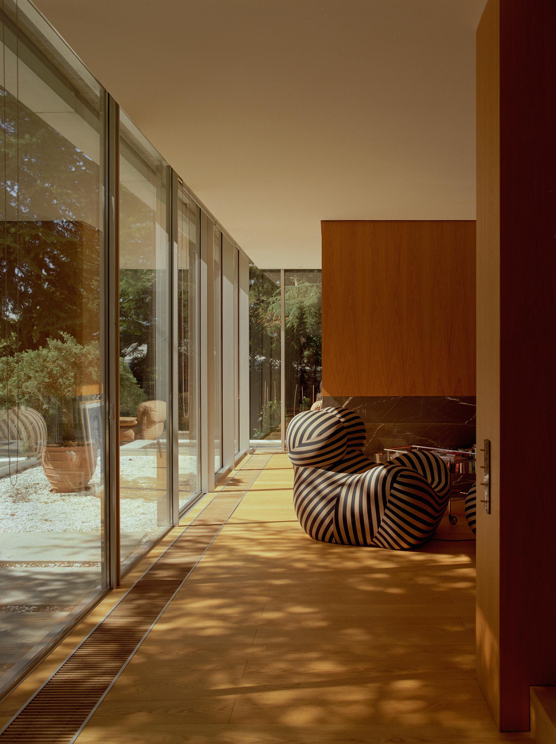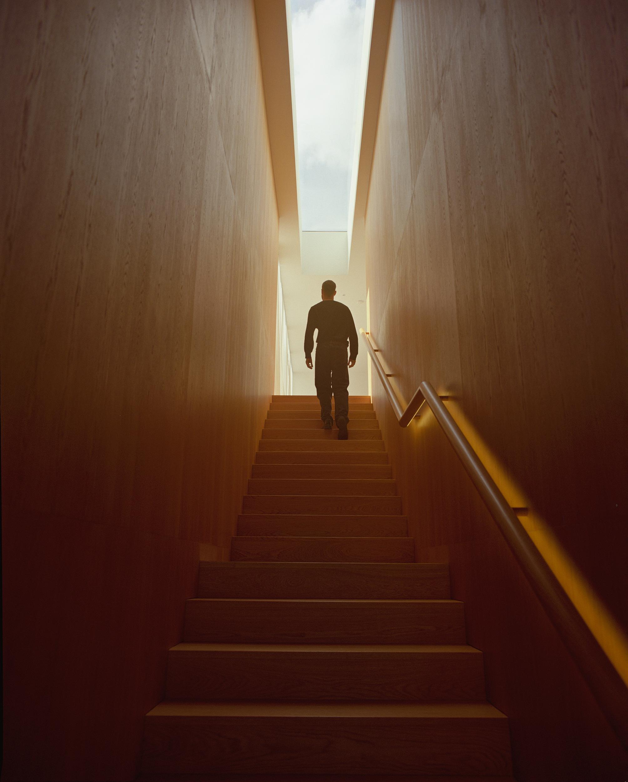 სივრცეებს შორის მოძრაობა მიმდინარეობს ორ დიაფრაგმას შორის გაჭრილი კიბის უჯრედის გავლით — ეს არის ელემენტი, რომელიც პროექტის ერთ-ერთ მთავარ არქიტექტურულ ჟესტად იქცევა. კიბის ზემოდან ჩამოსული ბუნებრივი შუქი ინტერიერს აძლევს დრამატულობას და ქმნის განსაკუთრებულ განცდას, თითქოს მოძრაობა ფიზიკური გამოცდილების ნაცვლად, ემოციურ პროცესად იქცევა.