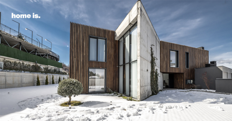 სახლის ფასადზე, შესასვლელის მხრიდან, უხეში ბეტონია გამოყენებული, რომელიც ბუნებრივი მუხის ვერტიკალური ელემენტებითაა დაბალანსებული. ექსტერიერის თეთრად შეღებილი უხეში ნალესი, შედარებით მსუბუქი ბეტონის ტექსტურებითა და მეტალის შავი ვერტიკალური მოაჯირებით ეზოს სიმწვანეს იდეალურად ეხამება.