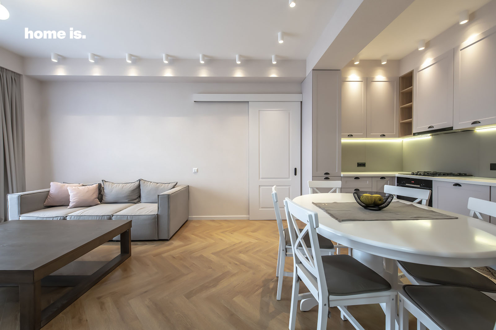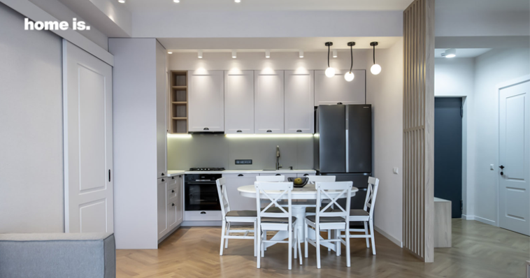 გაერთიანებული მისაღები და სამზარეულო სისადავითა და სიმსუბუქით ხასიათდება. ღია ფერის ავეჯი კედლების ფერს ჰარმონიულად ერწყმის. ზონას განსაკუთრებულ მყუდროებას ჰმატებს კომპაქტური სამზარეულო, რომელშიც თეთრი და რძისფერი ჭარბობს. სივრცეს ვიზუალურად ამდიდრებს მრგვალი სასადილო მაგიდა, რომელიც დახვეწილი დიზაინით გამოირჩევა. მთლიანი ბინის მსგავსად, განათება აქაც დიდ როლს ასრულებს – გამოკვეთს ზონას და ხაზს უსვამს მის იერსახეს.