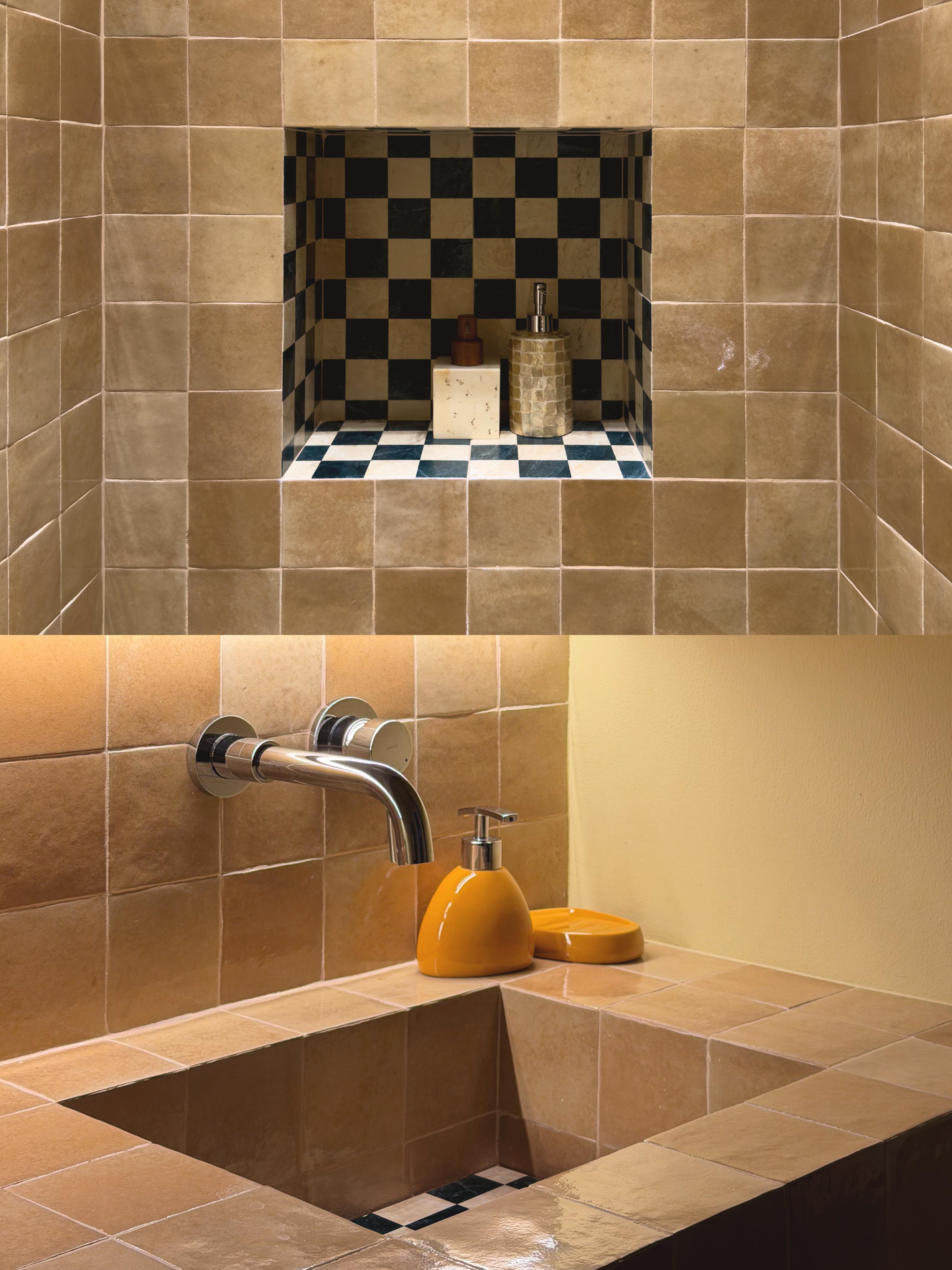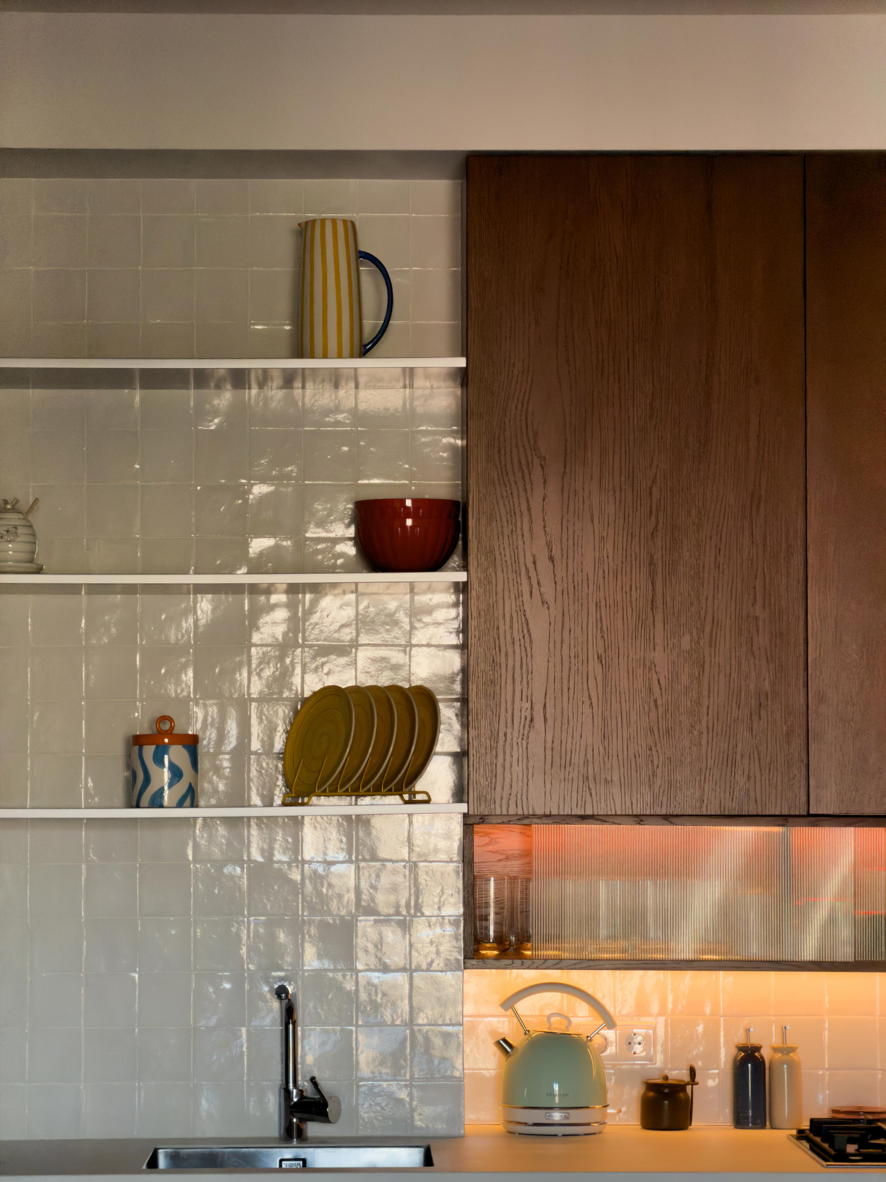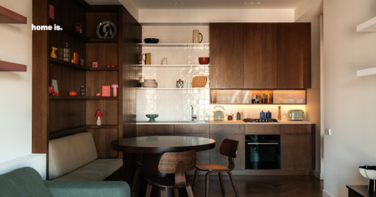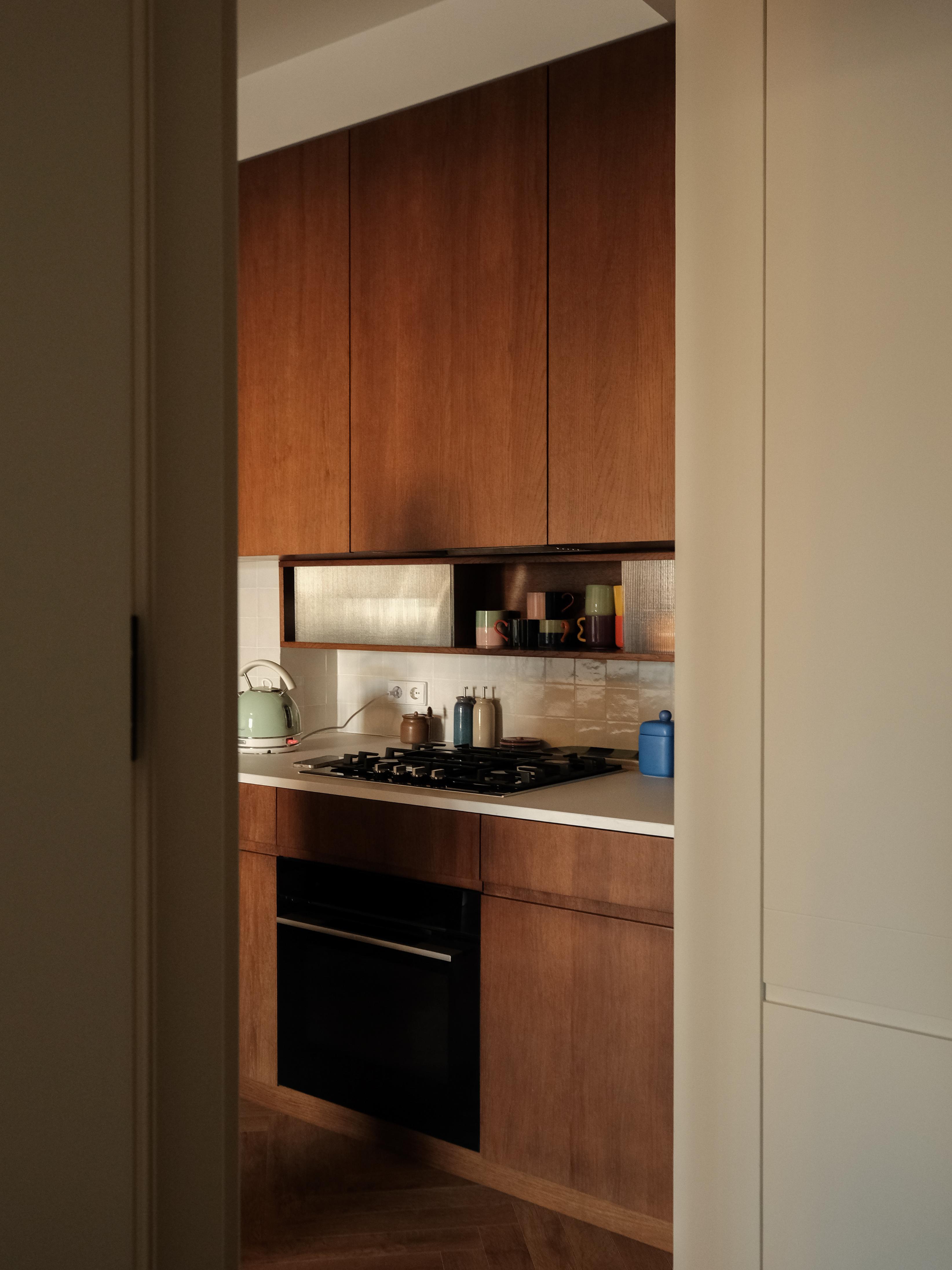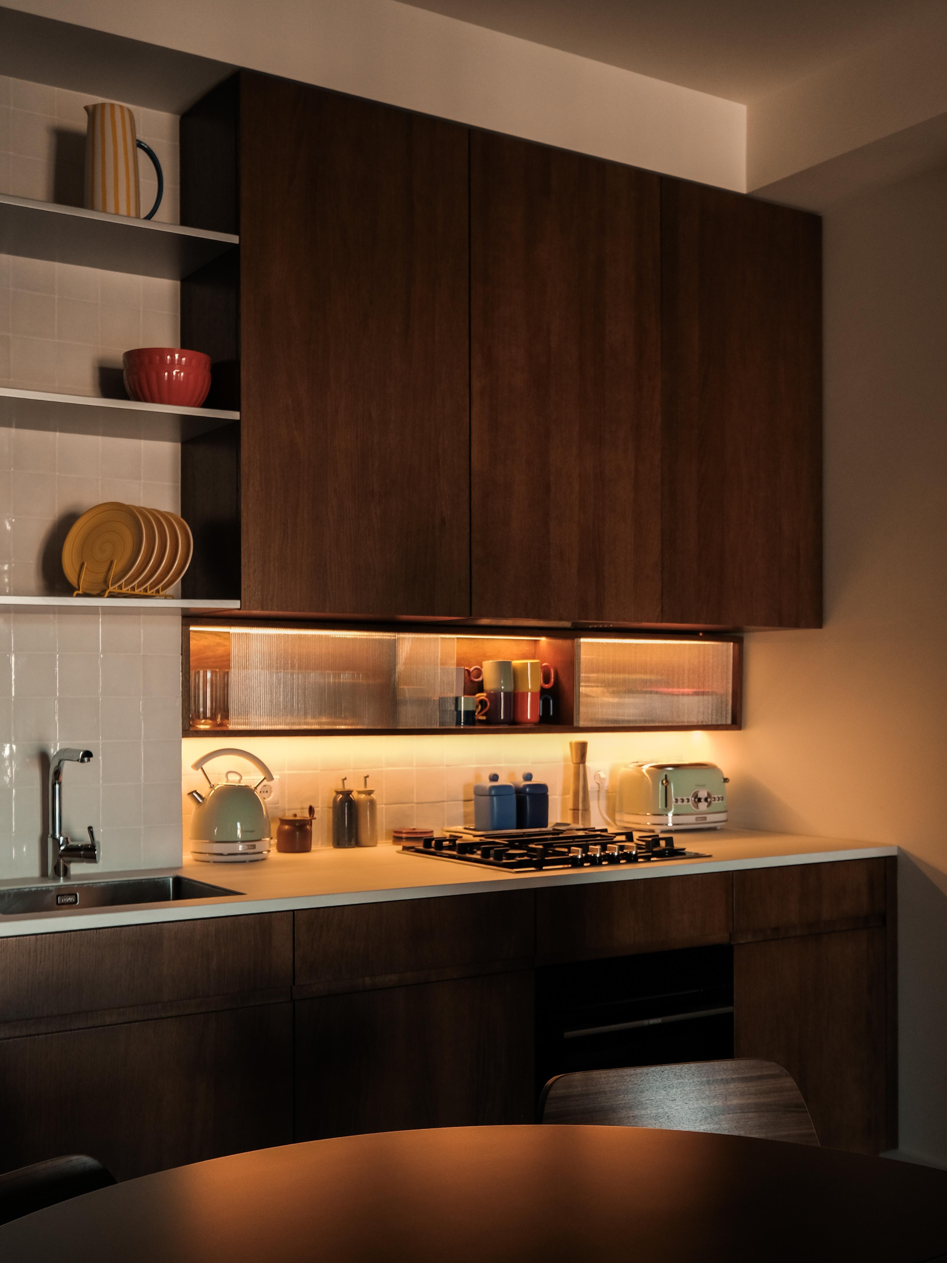 საერთო სივრცეში ცენტრალური როლი სამზარეულოს ენიჭება, რომელიც ღია გეგმარების წყალობით, საცხოვრებელ ზონას უერთდება და ფუნქციურობას ვიზუალურ სიმშვიდესთან აერთიანებს. ბუნებრივი ხის კარადები მასალას მთავარ გამომხატველ ელემენტად აქცევს, ხოლო კერამიკული ზედაპირები და ტექსტილები კომპოზიციას სიღრმეს მატებს გადატვირთვის გარეშე. ღია თაროები ინარჩუნებს ყოველდღიურ პრაქტიკულობას და ერთდროულად ქმნის მსუბუქ, ცოცხალ ვიზუალურ რიტმს, სადაც ხშირად გამოყენებული ნივთები სივრცის ორგანულ ნაწილად იქცევა.