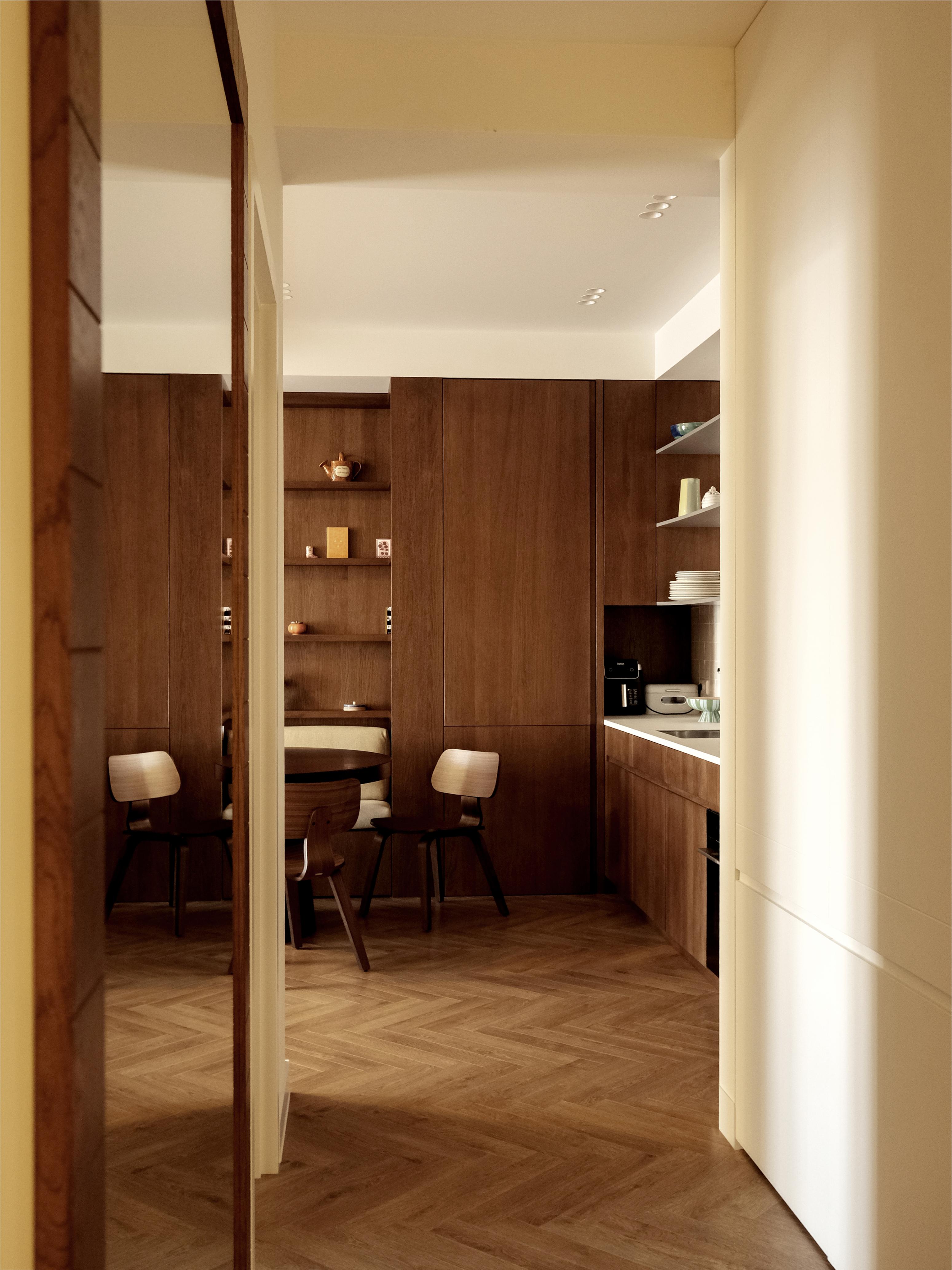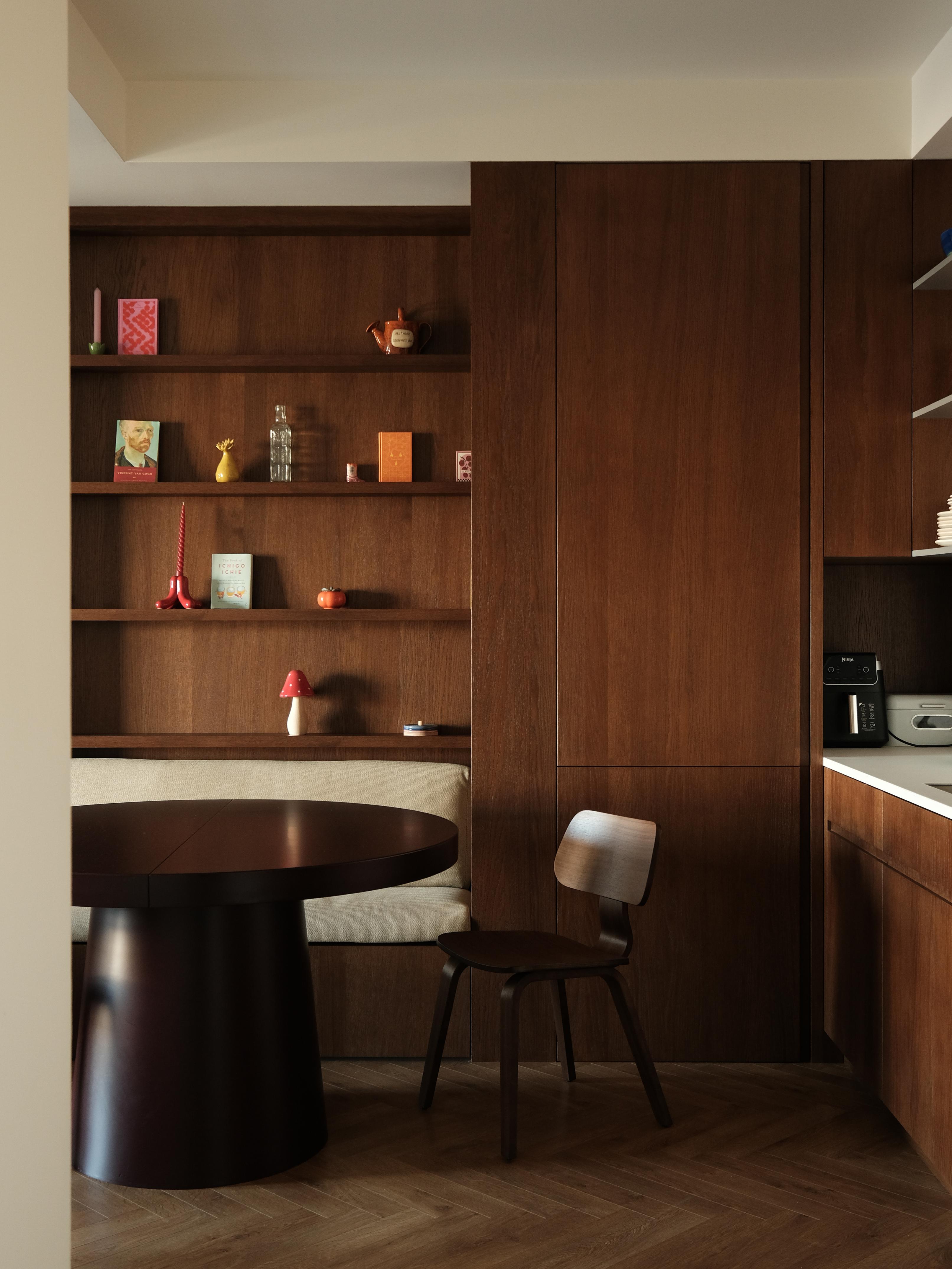სასადილო ზონა საერთო გეგმაში ბუნებრივად ინტეგრირდება. ჩაშენებული ბენჩი სივრცის ეფექტურ გამოყენებას უზრუნველყოფს, ზრდის დასაჯდომი ადგილის რაოდენობას და ამავე დროს, ოთახის არქიტექტურულ სიზუსტეს უსვამს ხაზს. ბურგუნდის ფერის აქცენტები ხის თბილ ტონებთან კონტრასტს ქმნის და ზონას გამოკვეთილ, თუმცა მთლიან სივრცესთან ჰარმონიულ ხასიათს ანიჭებს.