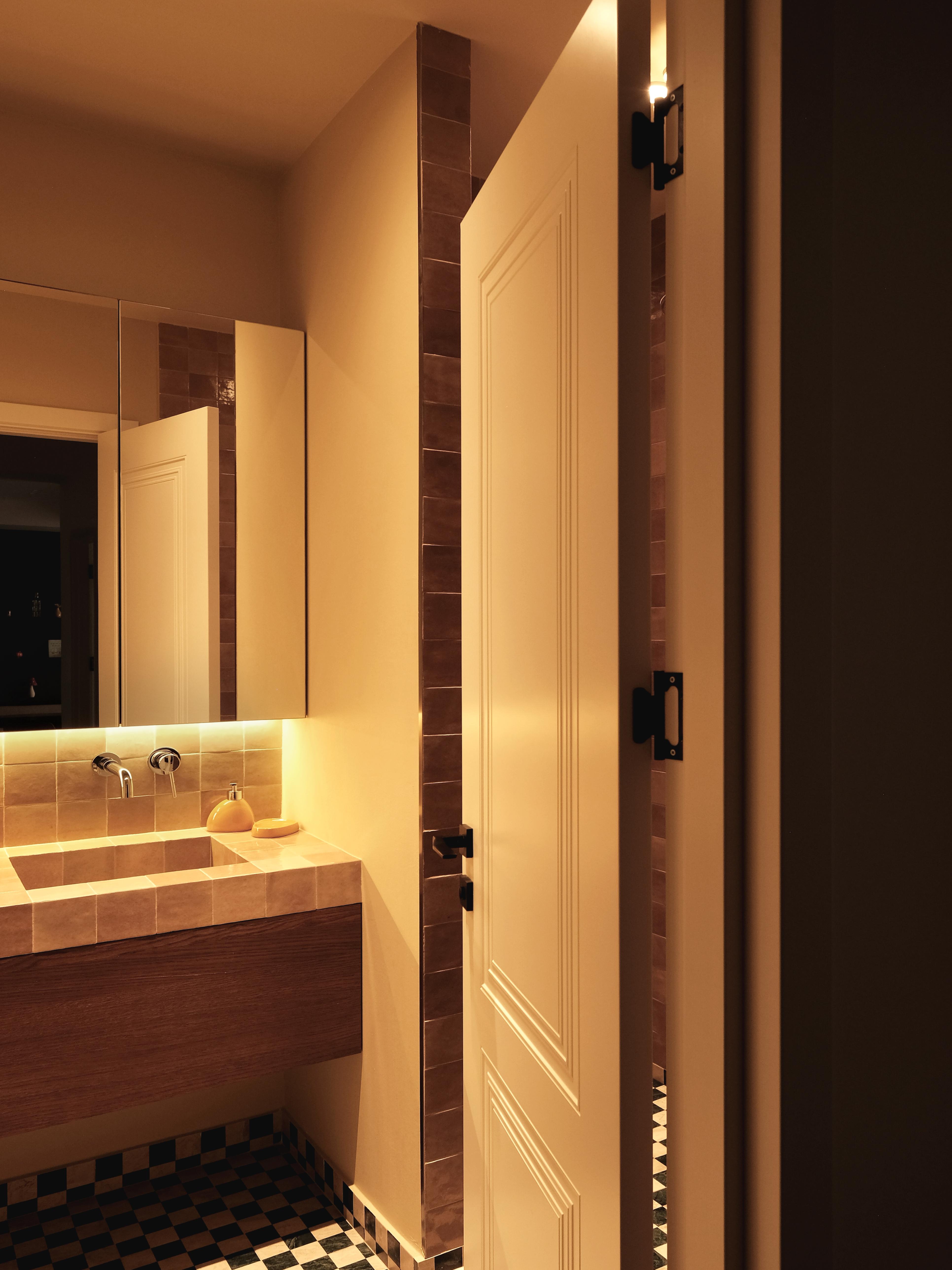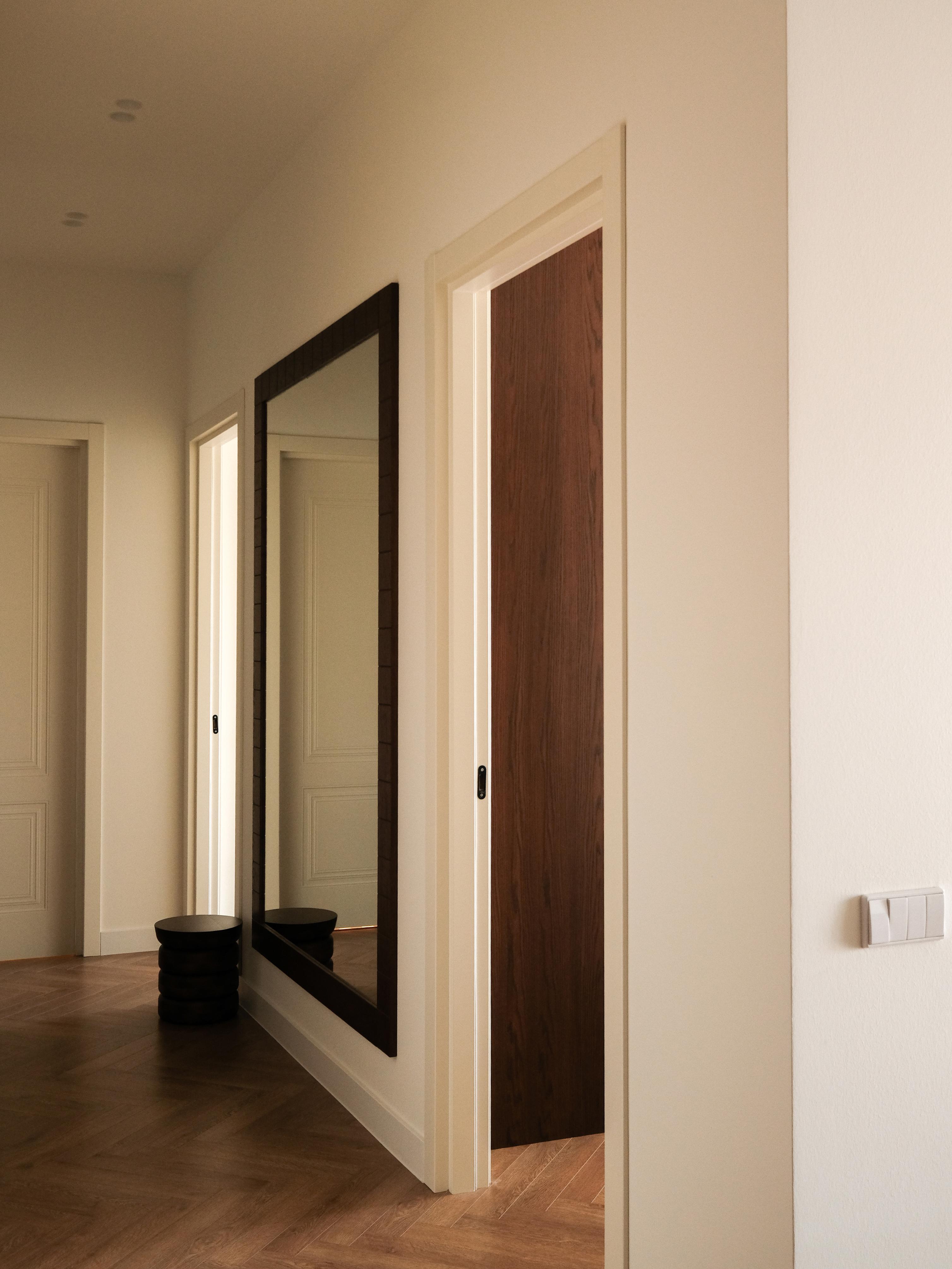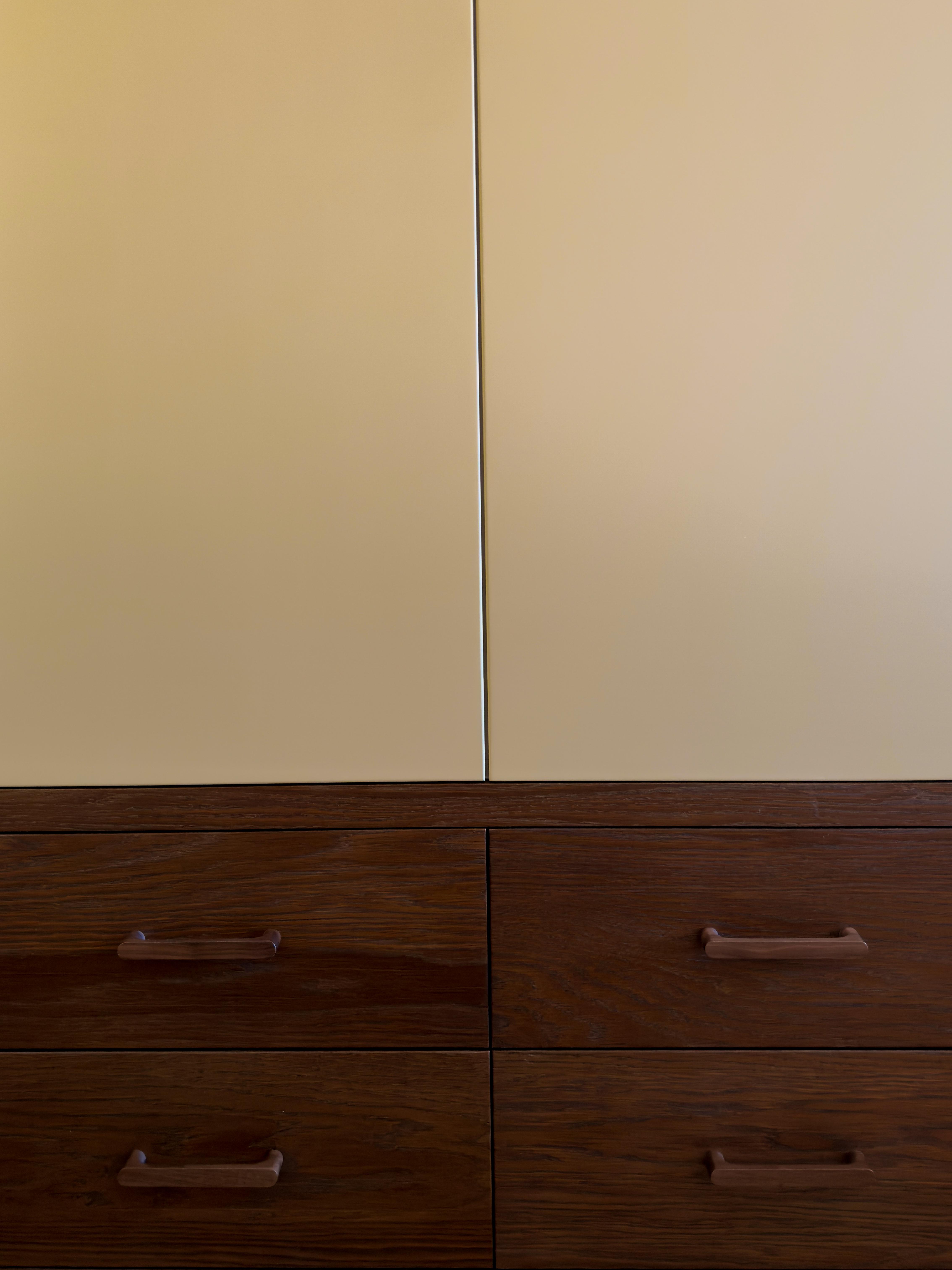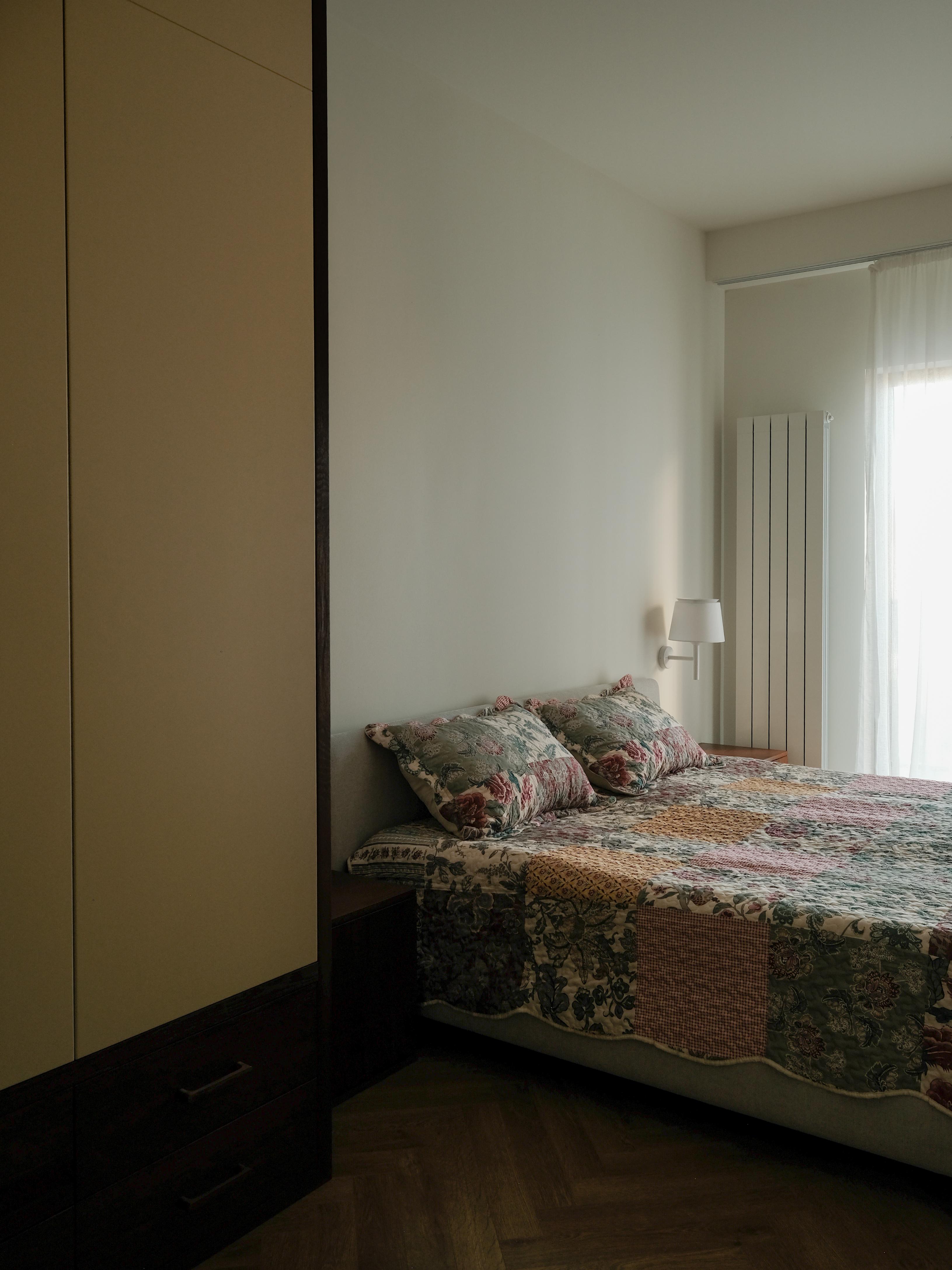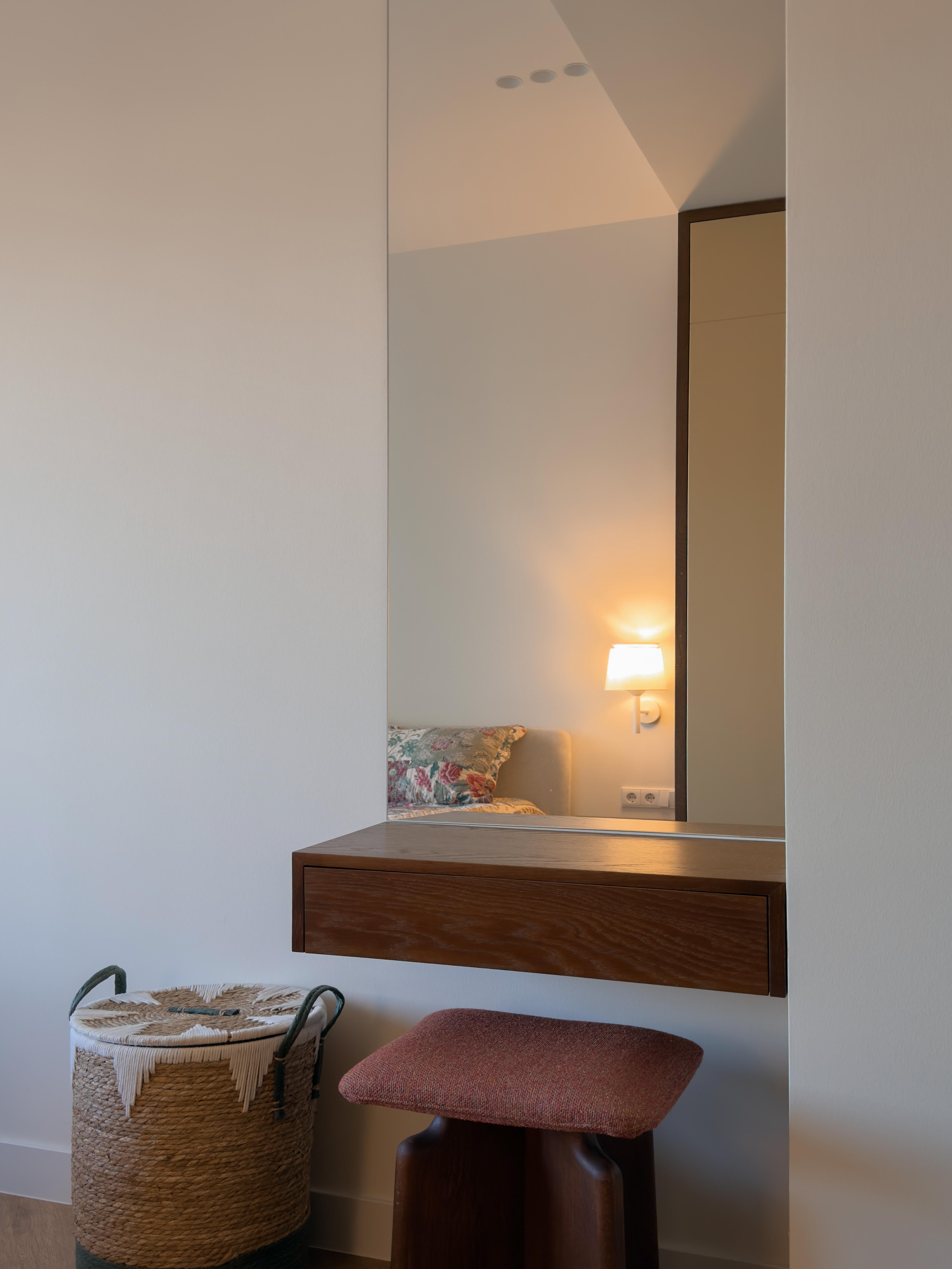 საძინებელშიც იგივე პრინციპი გრძელდება: ჩაშენებული სათავსოები არქიტექტურულ გარსს ერწყმის, ამცირებს ვიზუალურ ქაოსს და სივრცეს შეკრულ, მშვიდ სახეს აძლევს. ნეიტრალური ტონები, რბილი ტექსტილები და ფრთხილად დაგეგმილი განათება ინტიმურ ატმოსფეროს ქმნის, ხოლო ხის ზედაპირებე სივრცეში სითბო და ბუნებრივობა შემოაქვს.