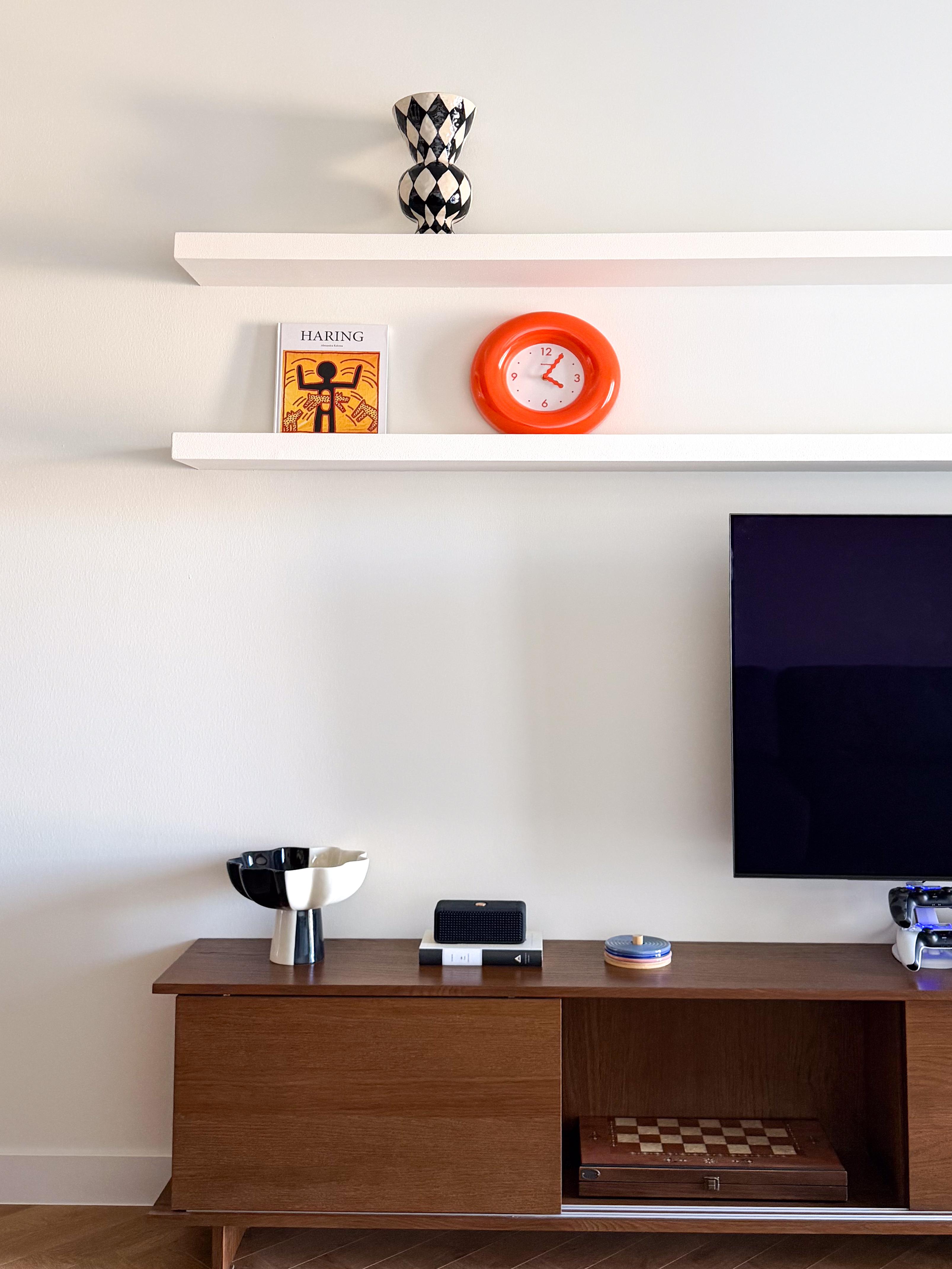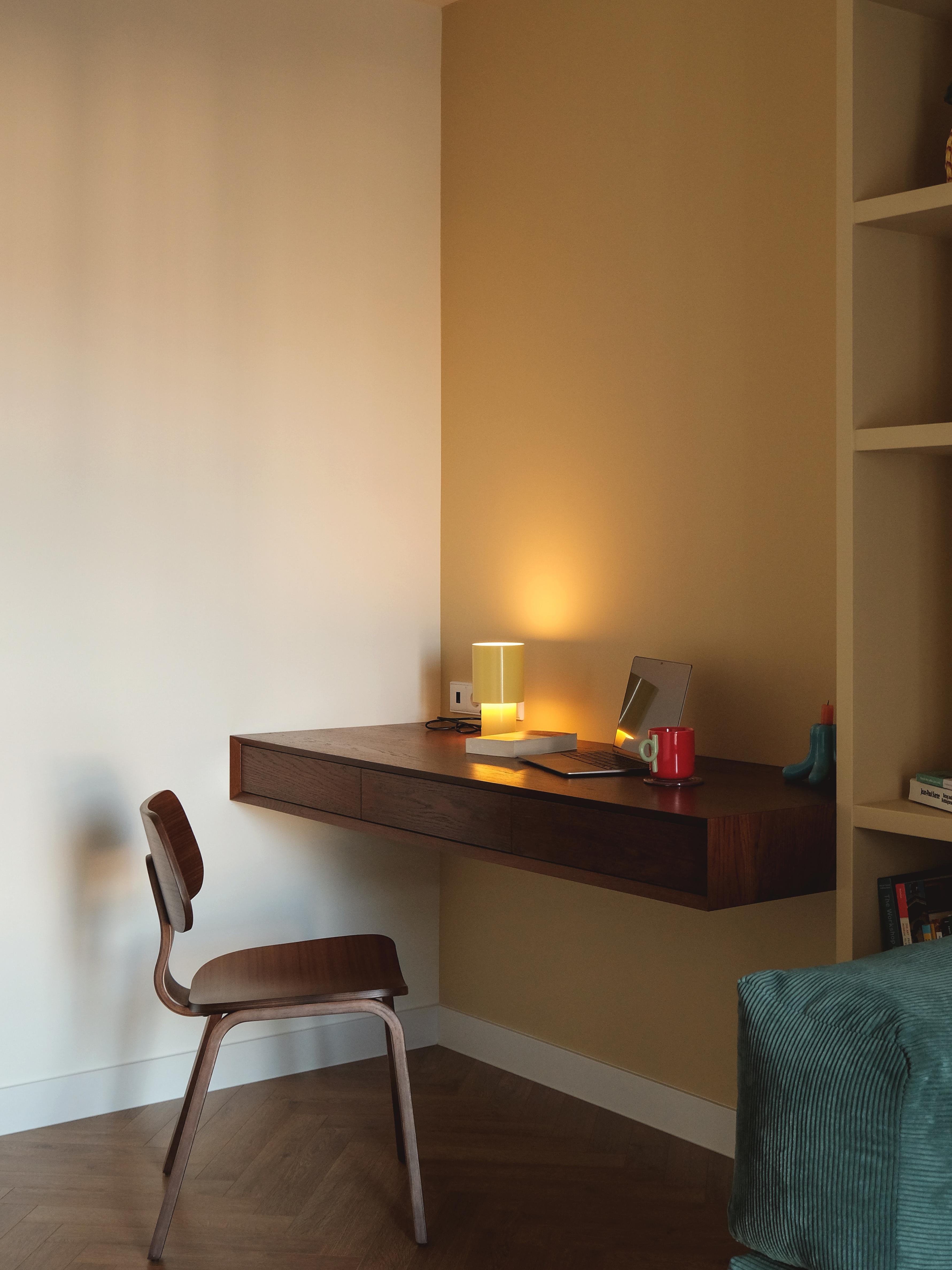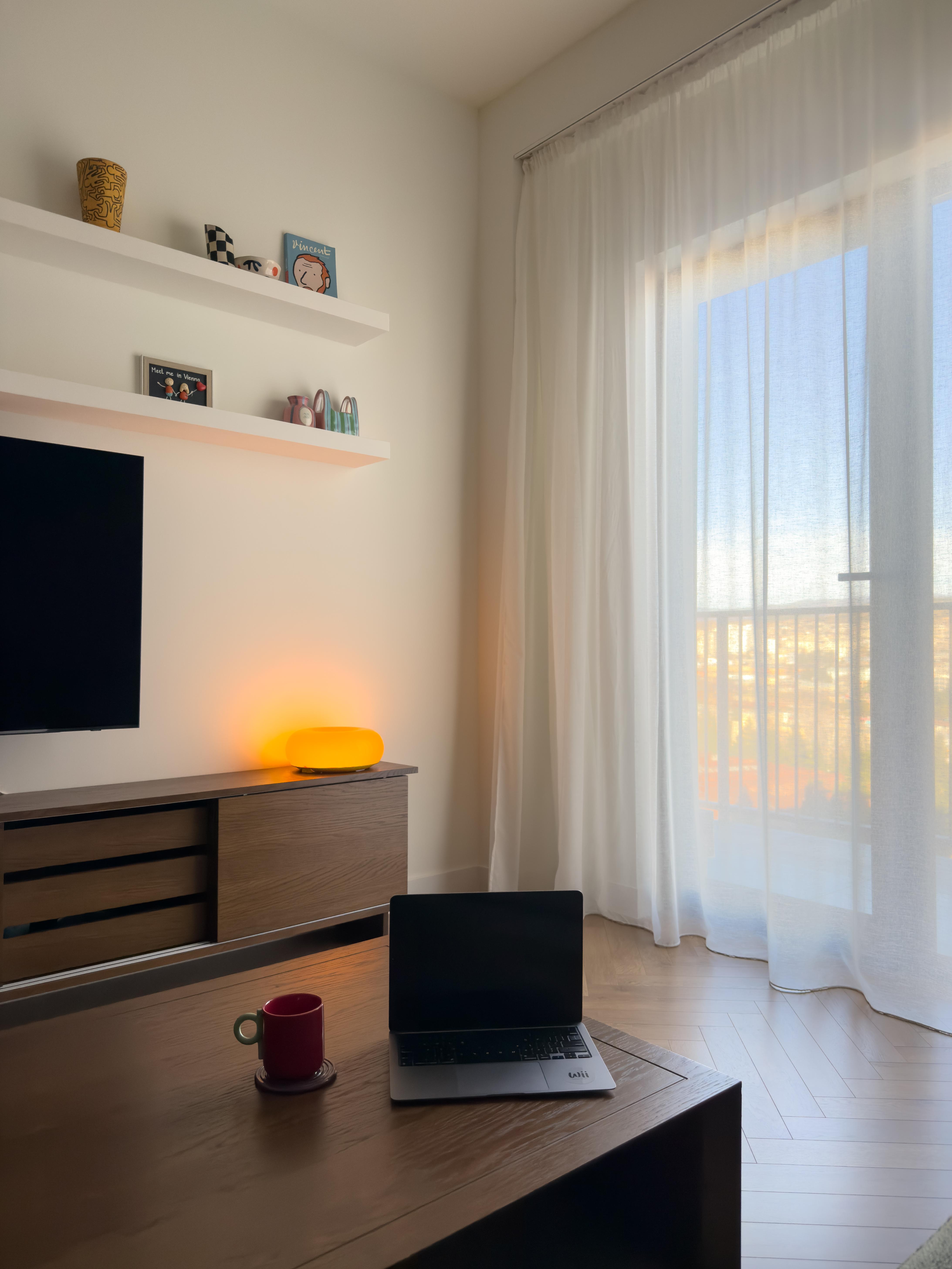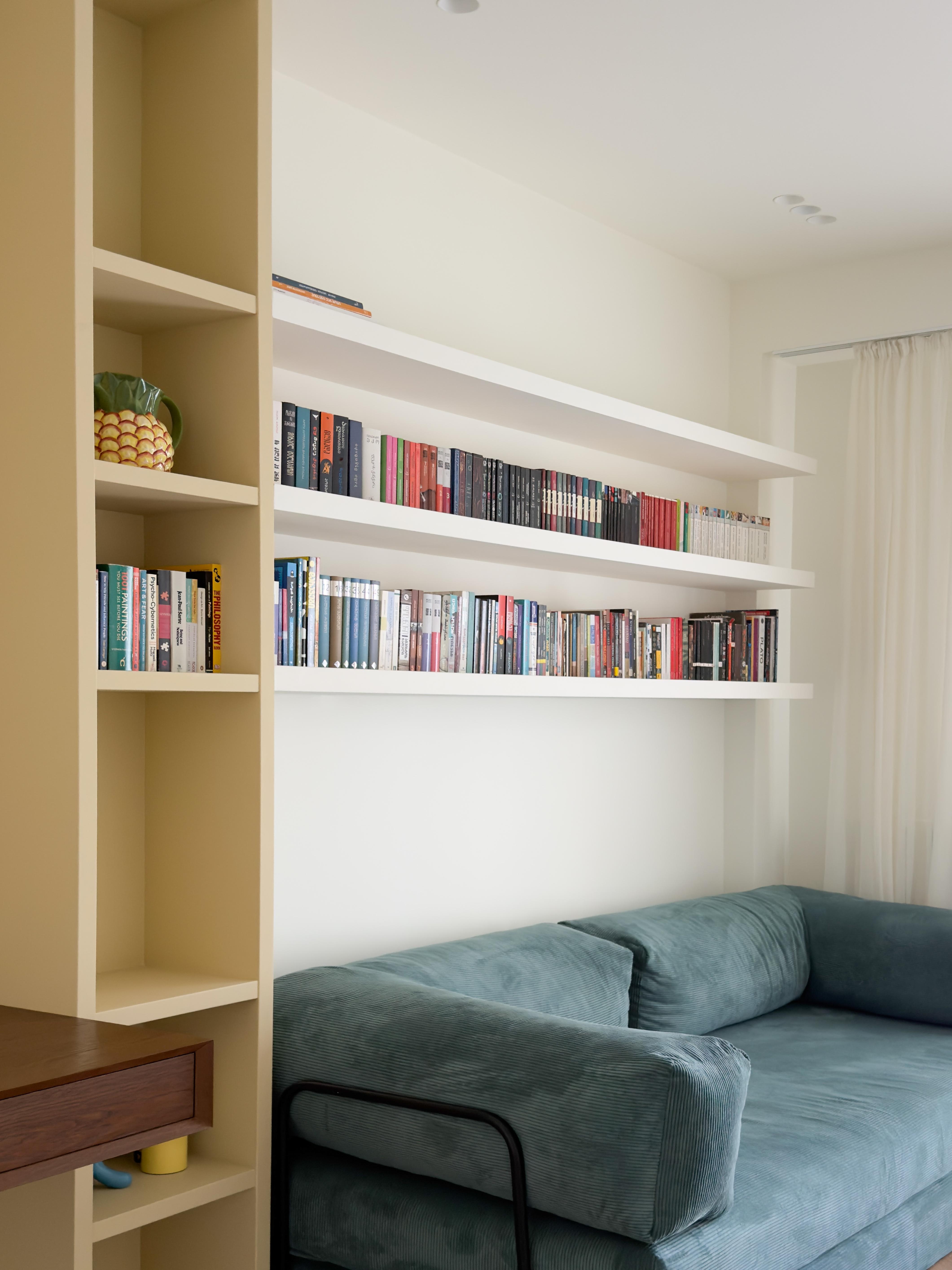 სამუშაო კაბინეტის ნაწილი გადაწყვეტილია როგორც კედლის არქიტექტურული გაგრძელება — კარადებისა და თაროების სისტემა დამოუკიდებელ ავეჯად კი არა, სივრცის სტრუქტურულ ნაწილად აღიქმება. ინტეგრირებული სამუშაო ზედაპირი სიმსუბუქის შეგრძნებას ქმნის, ხოლო ღია თაროები ვერტიკალურ რიტმს აყალიბებს. წიგნები და პირადი ნივთები აქ დეკორაციას არ წარმოადგენს, არამედ კომპოზიციის თანაბარუფლებიანი ელემენტებია, რომლებიც ინტერიერს ფერსა და ინდივიდუალობას მატებს.