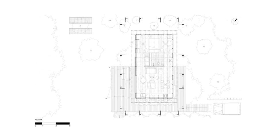 მიუხედავად იმისა, რომ სახლი მხოლოდ 45მ2-ის სიდიდისაა, სივრცე ფართო და შუქით სავსეა. მთავარი საცხოვრებელი ზონა და საძინებელი თავმოყრილია ცენტრალური ბირთვის ირგვლივ, რომელიც აერთიანებს საერთო მოხმარების საგნებს, რათა ყველა ოთახს ჰქონდეს მათზე წვდომა. შუშის ფასადები მთელი სივრცის ბუნებრივი შუქით ავსებას უწყობს ხელს.