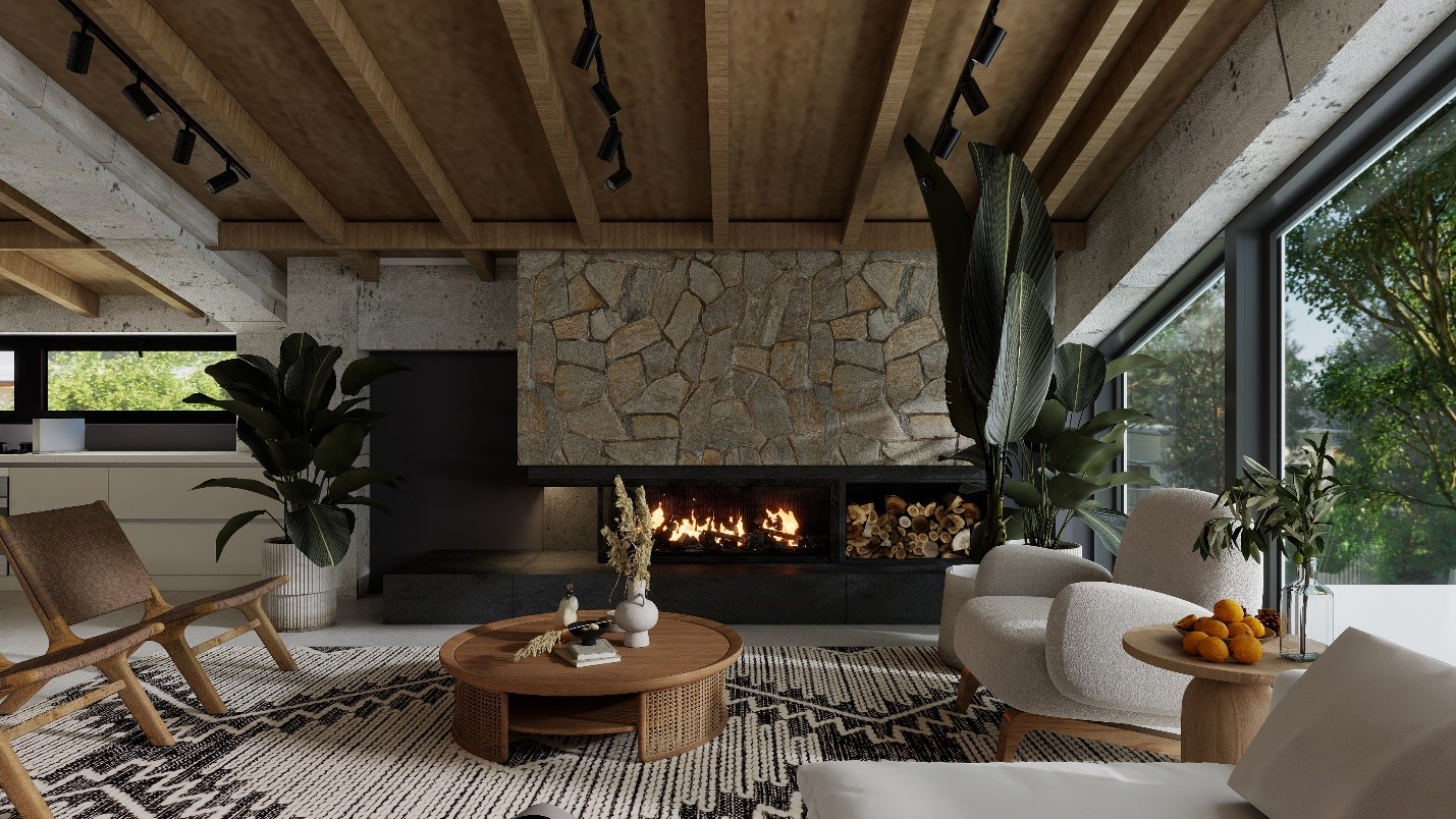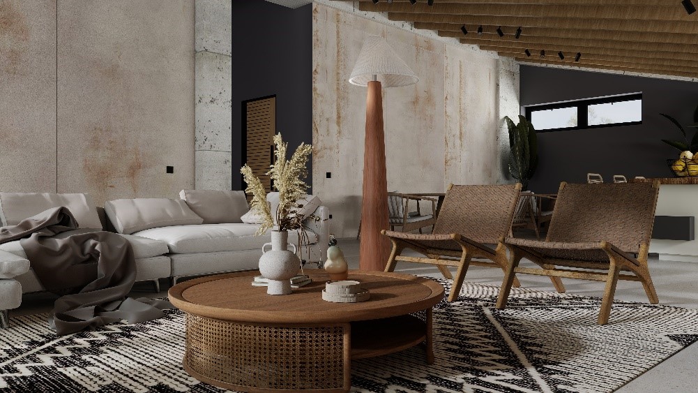 სამზარეულო, მისაღები და საძინებლები ერთიანდება ნატურალურ ფერებში, ხოლო დეტალები – შავი მეტალის აქცენტები, ტექსტილის ბუნებრივი ფაქტურა – ქმნის მყუდრო, მაგრამ დახვეწილ გარემოს.