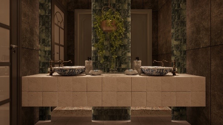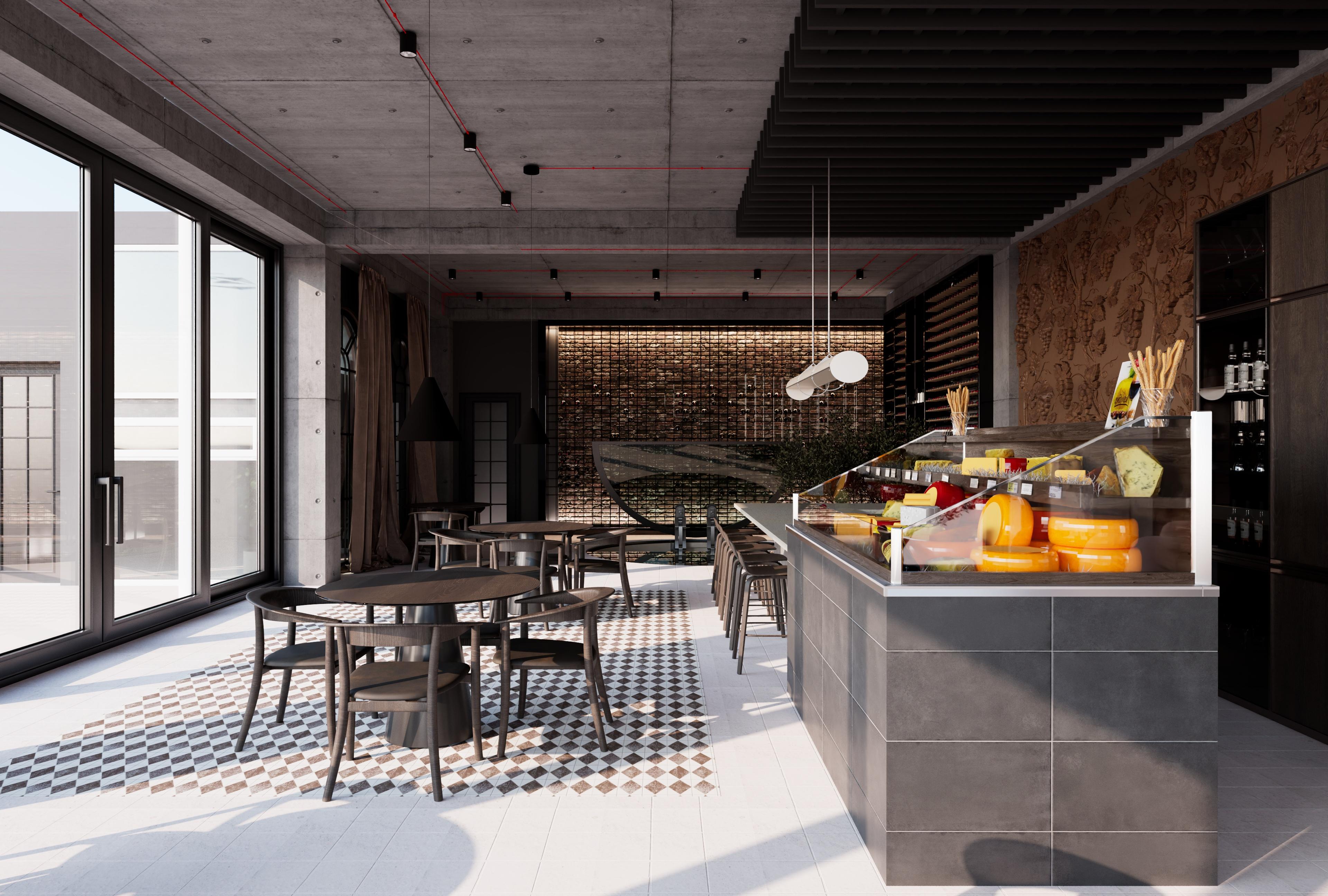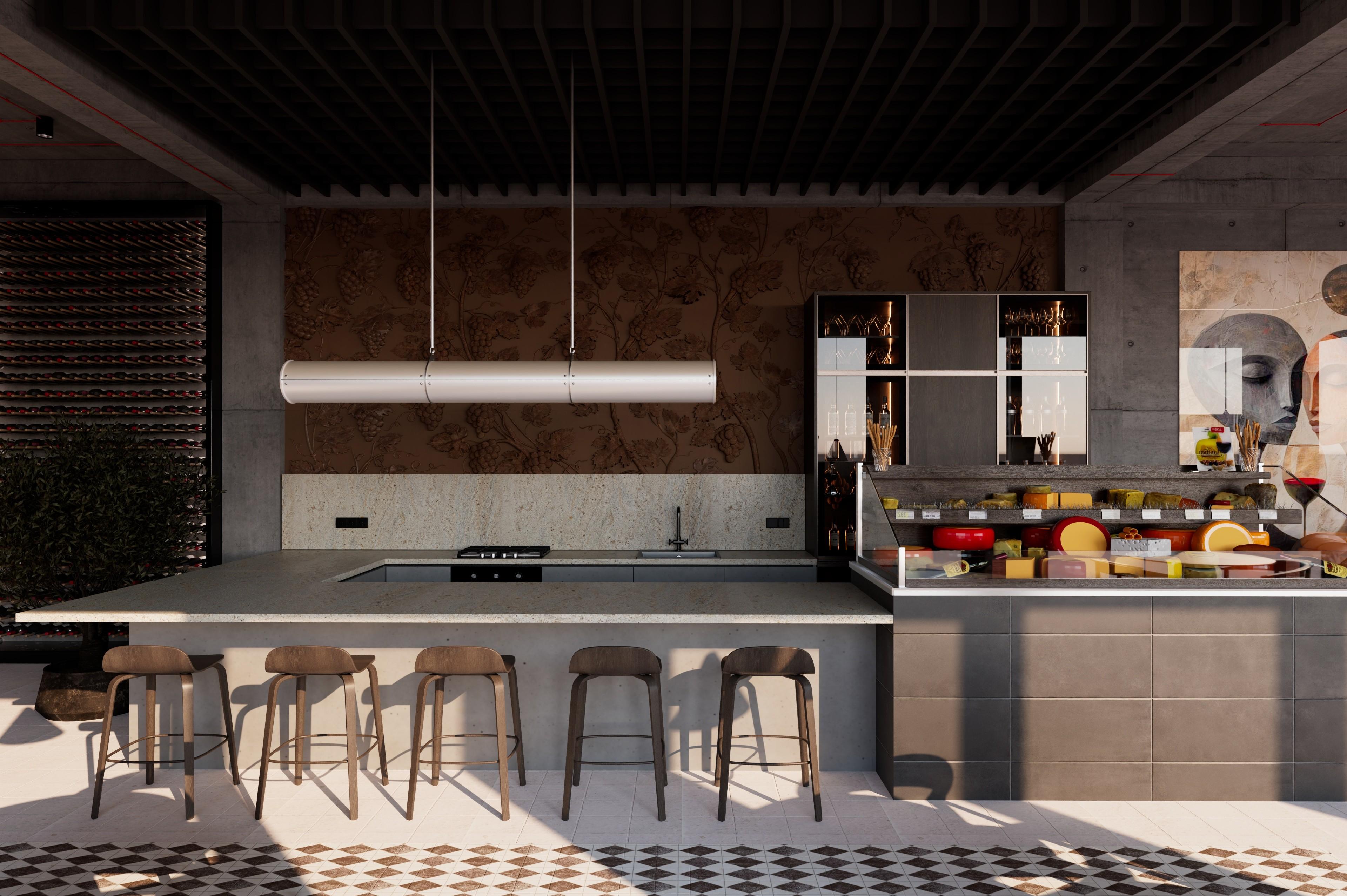 დიზაინში გამოყენებულია თიხისფერი და ქვის ტექსტურები, რომლებიც ქვევრის ბუნებრივ ფაქტურას მოგვაგონებს.