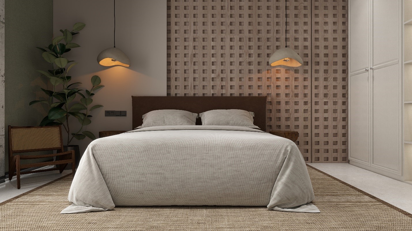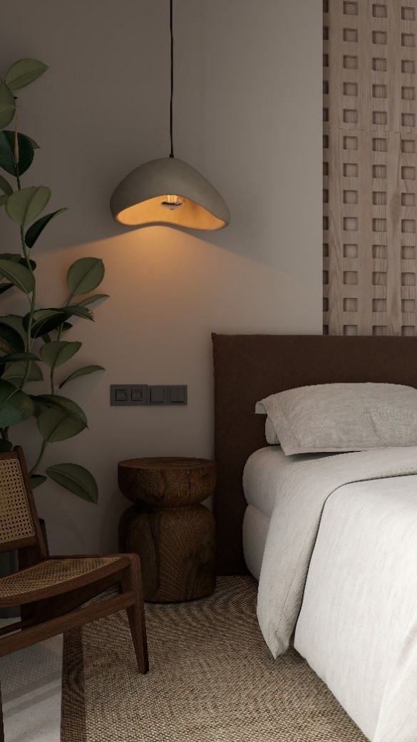 ზედა სართული მეპატრონის პირად სივრცეს ეკუთვნის. აქ დომინირებს ხის სითბო, რბილი განათება და დეკორატიული ელემენეტები, რომლებიც მთლიან დიზაინს აერთიანებს.