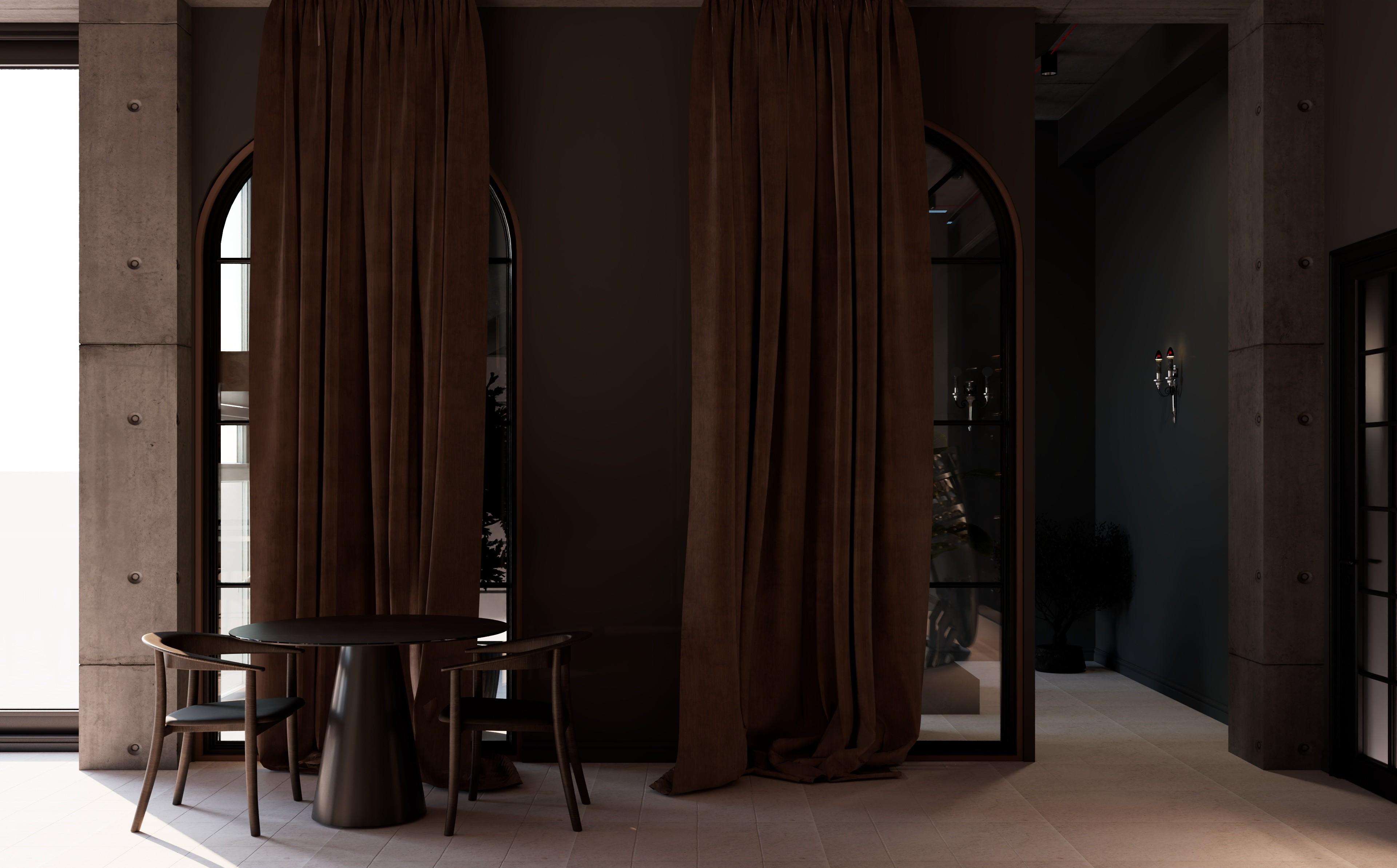 მეორე სართულის მისაღები სივრცე გამოირჩევა გრძელი, მასიური მაგიდით, რომელიც ერთდროულად ფუნქციურიცაა და სიმბოლურიც.