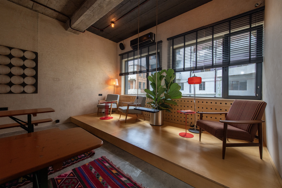 ინდუსტრიულ დიზაინს სიხალისესა და ფერადოვნებას მატებს ბუნებრივი გამწვანება, დეკორატიული სანათები და კედლის პრინტი, რომელიც ხელოვან სანდრო ფაჩუაშვილს ეკუთვნის.