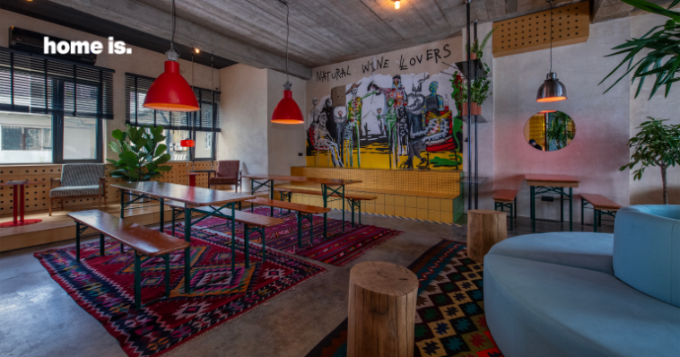 ლობიში თავმოყრილია სხვადასხვა ფუნქციური ზონა, რომლებიც ერთმანეთისგან ავეჯით არის გამიჯნული. ამ სივრცეში თავისუფლად არის შესაძლებელი კომფორტულად დასვენება, მუშაობა, წიგნის კითხვა, ნაცნობებთან თუ უცნობებთან ურთიერთობა და სადილობა. ინტერიერში აქტიურად არის გამოყენებული ხის მასალა, რაც ბეტონის იატაკსა და გალესილ კედელს აბალანსებს და ოთახს სიმსუბუქეს სძენს. თბილ ატმოსფეროს ქმნის ჭრელი ხალიჩებიც, რომლებიც სხვადასხვა ფუნქციურ ზონაშია განთავსებული და რბილი ფერადი ავეჯი.