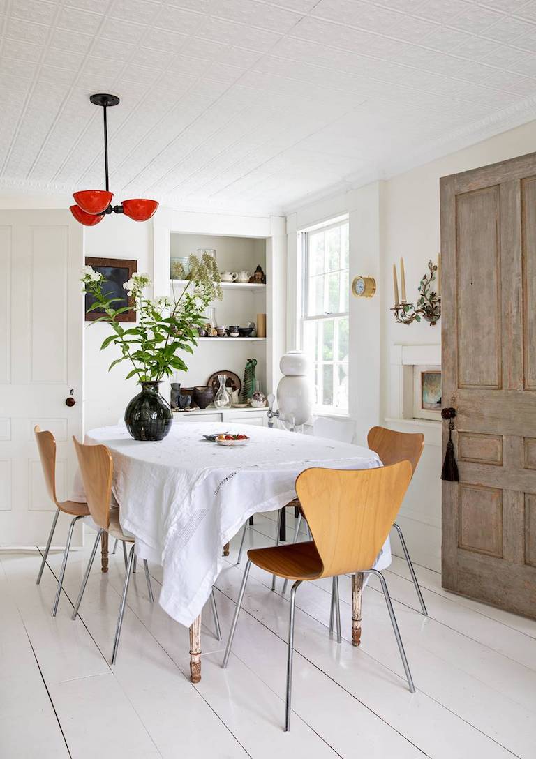 ამ დიდ სახლის სასადილო ოთახში წარმოდგენილია ანტიკვარული, ვინტაჟური და თანამედროვე ტექსტურების მიმზიდველი ნაზავი. ხის კარი და ხის სკამები ერთგვარად ავსებენ თეთრ სამზარეულოს.