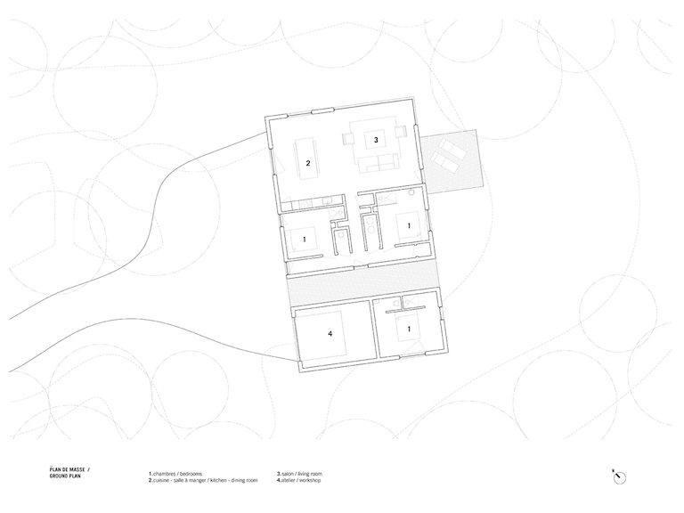 “კლიენტის ფუნქციური მოთხოვნილებები სტრატეგიულად ნაწილდება ორ დამოუკიდებელ შენობაში, რომლებიც დაკავშირებულია ბილიკით. ძირითადი და უფრო დიდი ნაწილი მოიცავს მისაღებ ოთახსა და საძინებლებს, ხოლო მეორე ნაწილი მოიცავს ფუნქციურ ზონებს, როგორიცაა სახელოსნო და სტუმრების საძინებელი/ლოფტი საკუთარი აბაზანით. კლიენტის სურვილი იყო, ეს სივრცეები ცალ-ცალკე ყოფილიყო მეტი კონფიდენციალურობის შესანარჩუნებლად,” – ამბობენ არქიტექტორები.