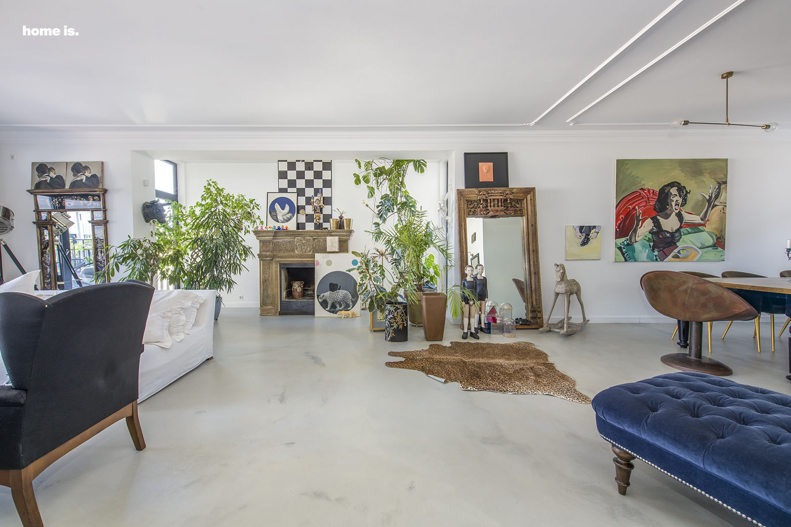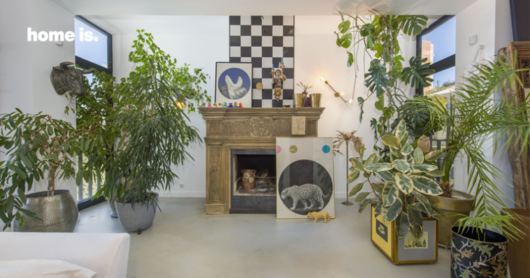 სახლის ყველაზე დიდ ოთახში კი განთავსებულია მისაღები და სასადილო სივრცეები. აქვე ვხვდებით ძველებურ ბუხარს, ლეოპარდის ხალიჩას, ერთი შეხედვით დაუდევრად დაკიდებულ განათებებსა და ძალიან ბევრ მაღალ მცენარეს.