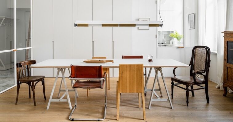კედლებს ჩაუტარდა რესტავრაცია და თეთრად შეიღება, იატაკზე კი ხის პარკეტი დაიგო. თეთრი ფერი საუკეთესო გამოსავალი აღმოჩნდა, რადგან ბინა პირველ სართულზეა და მასში არც ისე ბევრი ბუნებრივი შუქი შემოდის. ამ სახლში სასადილო ადგილიც იმდენად მნიშვნელოვანია, რამდენადაც სახლის ოფისი, სადაც არქიტექტორები მეგობრებთან ერთად იკრიბებიან. ინტერიერში ბევრი სხვადასხვანაირი ტიპის განათება და რამდენიმე ანტიკვარული ნივთი გვხვდება, რომელიც წყვილმა მემკვიდრეობით მიიღო წინა თაობებისგან.