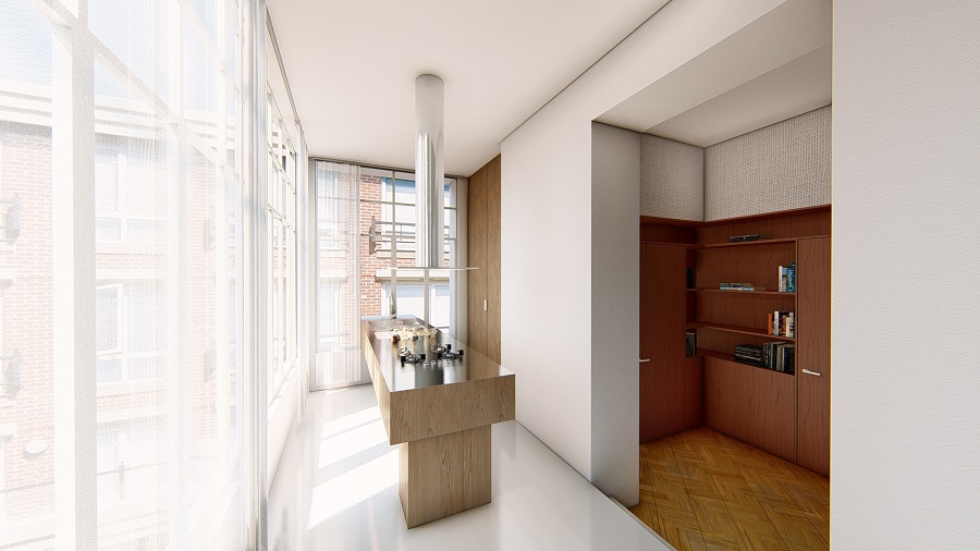 შუშაბანდის ეფექტის გასაზრდელად დიზაინერებმა მეორადი კედლის ღიობები გააუქმეს და კედლიდან მხოლოდ კოლონები დატოვეს. გეგმარებაში გამოყენებულია ე.წ. ‘ფურნიტექტურის’ მეთოდი, რაც გულისხმობს სივრცის ავეჯით გარდაქმნას. ამ პრინციპის თანახმად, მისაღები და საძინებელი სივრცეები ერთმანეთისგან გამოყოფილია კარადით, რომელსაც ორმხრივი გამოყენება აქვს.