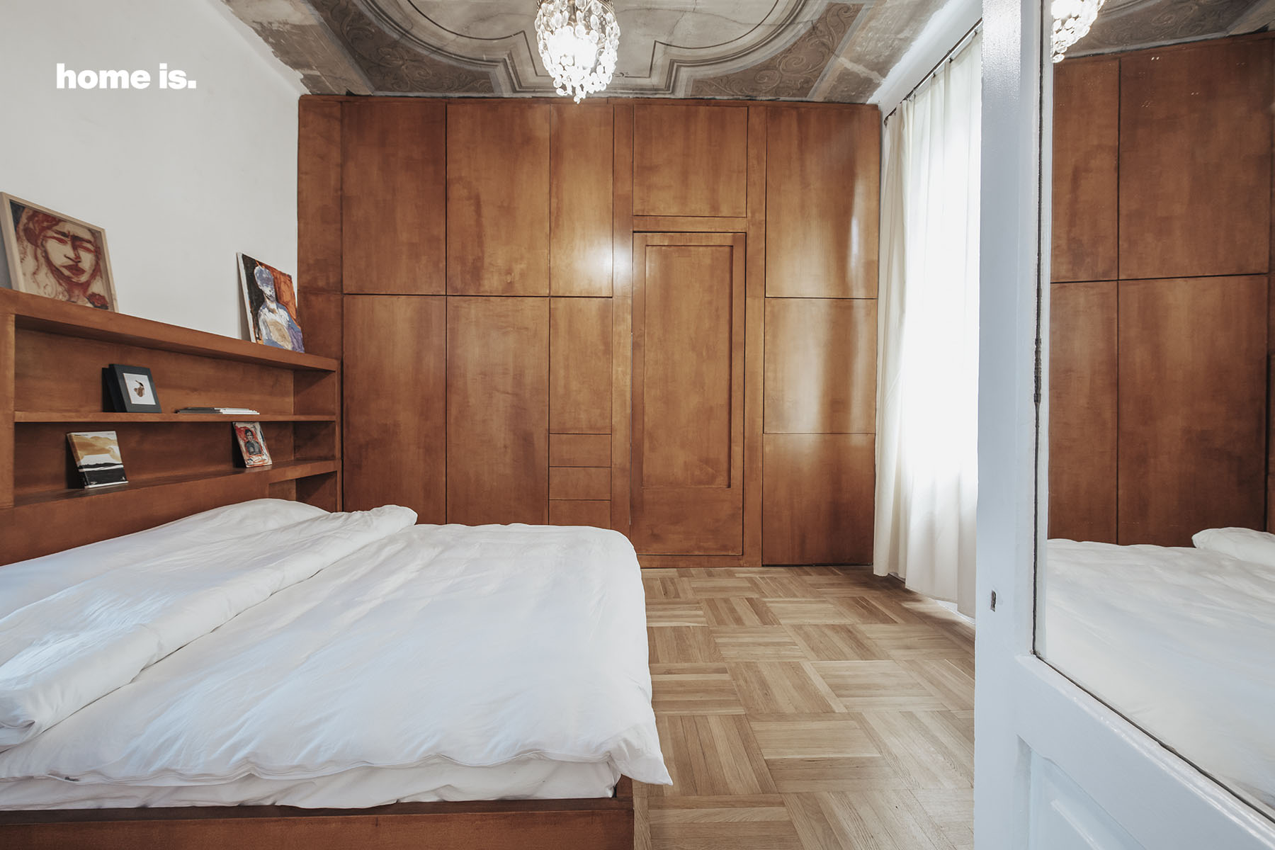 საძინებელში მთელ კედელში ჩაშენებულია კარადა, რომელსაც ებმის საწოლი. კარადის ერთ-ერთ კარი კი აბაზანის შესასვლელია. ამ მეთოდით პროექტის ავტორებმა თავიდან აირიდეს დამატებითი კარის გაჩენა ოთახში.
