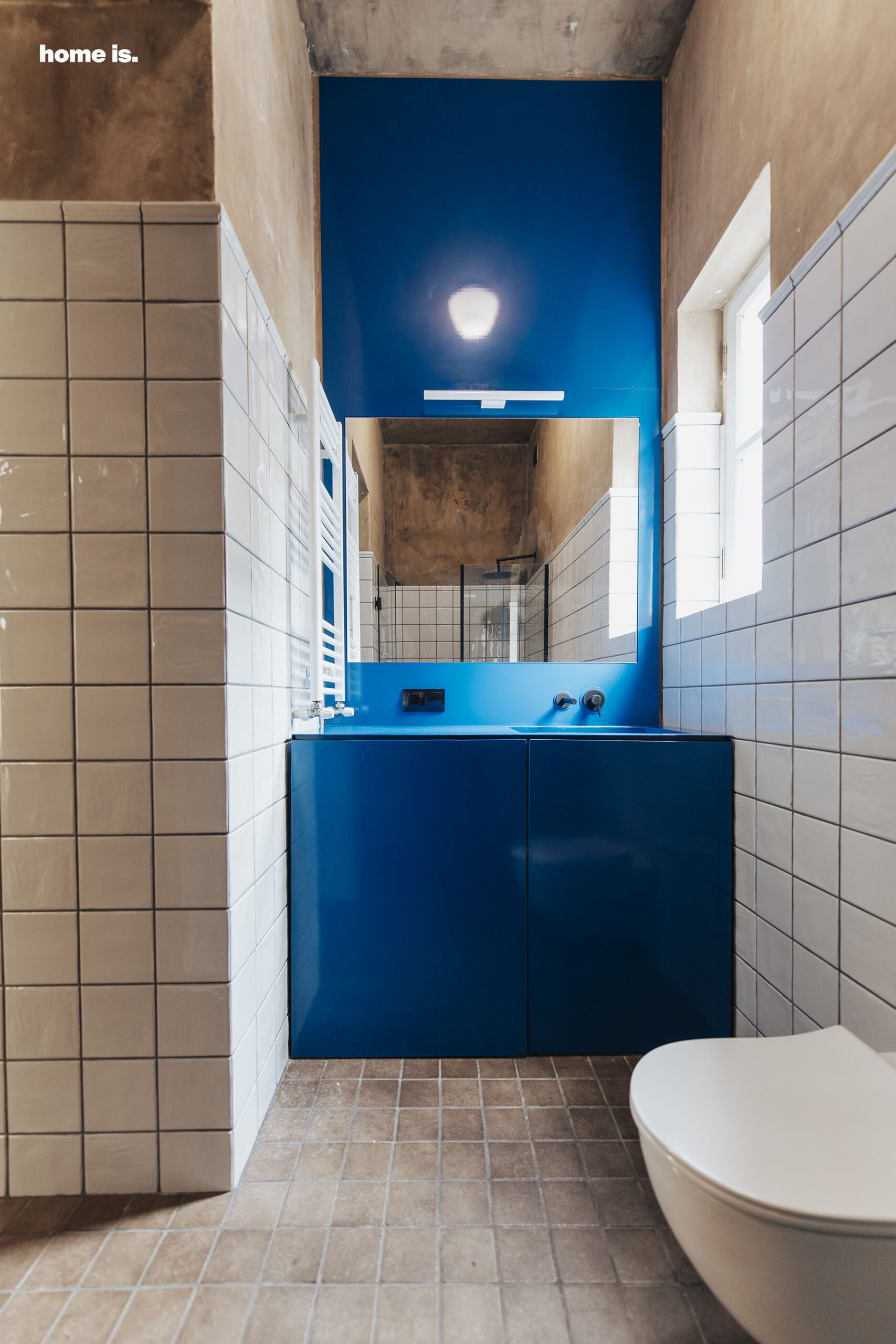 ინტერიერის თანამედროვე შტრიხები ასევე გვხვდება საძინებელთან არსებულ აბაზანაშიც. ამ შემთხვევაში ეს არის მყარი, ერთიანი ზედაპირის მქონე ლურჯი ხელსაბანი. ასევე საინტერესოა კედლების მოპირკეთება – ფილების კლასიკური დაბოლოების შემდეგ მეორდება სიძველისგან გაჩენილი ტექსტურა ლაქებით, რომელიც დიზაინერებს ადგილზე დახვდათ.
