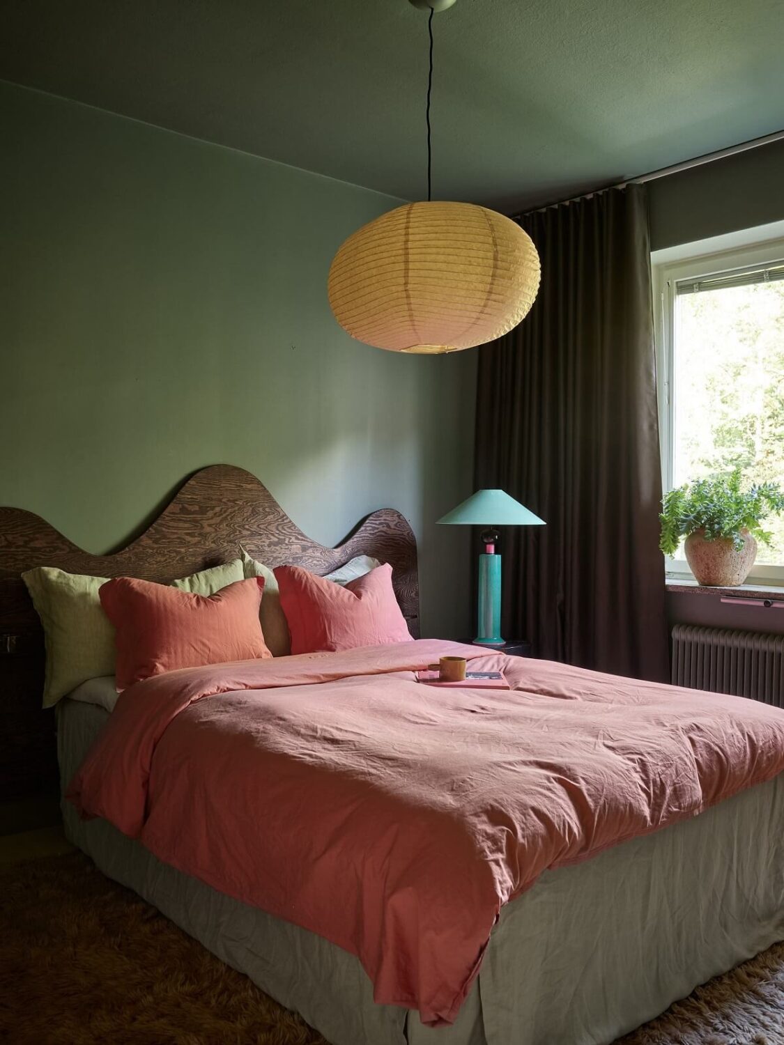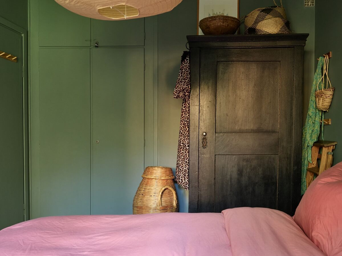 საძინებელი ოთახის კედლები მუქ მწვანე ფერშია შეღებილი. ოთახს ამშვენებს ხის ძველებური კარადა და სხვადასხვა დეკორაციები.