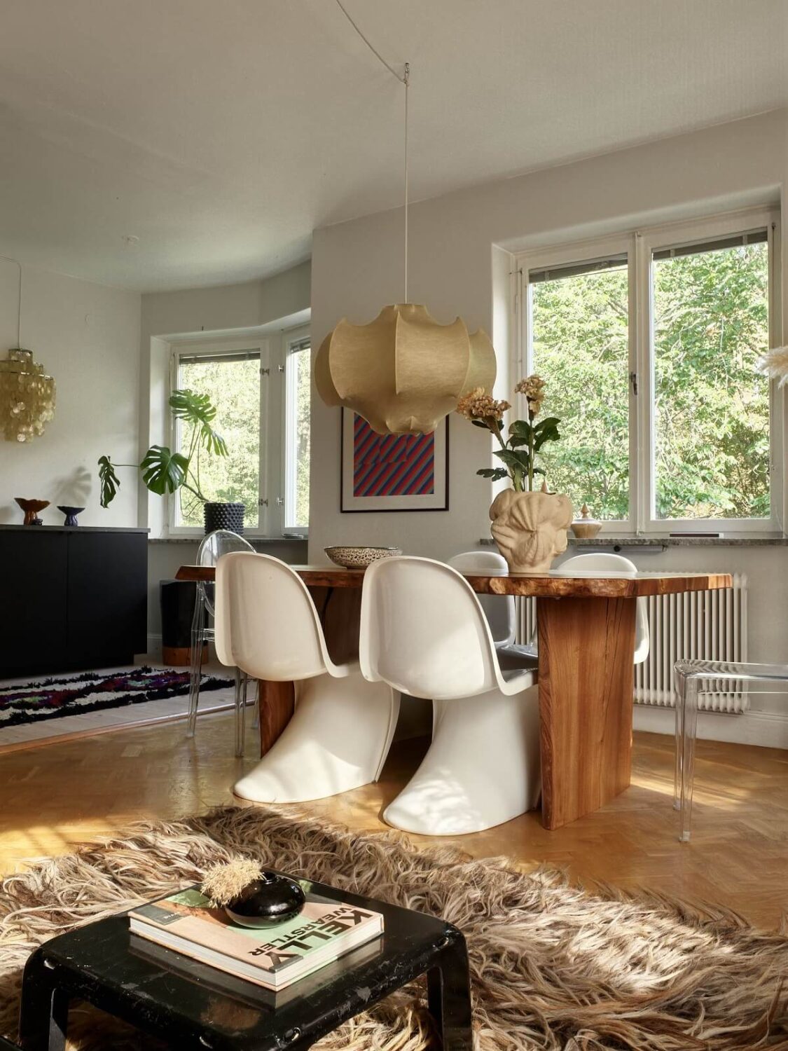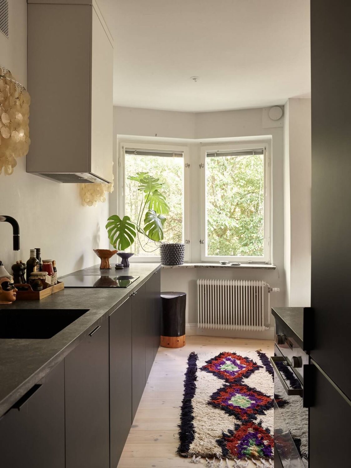 აპარტამენტს აქვს დიდი ფანჯრები, საიდანაც დღის განმავლობაში სახლში მზის სხივების სითბო და სინათლე აღწევს. შუა საუკუნეების სტილი, რაც გამოიხატება იატაკსა და ვარდისფერ ტონებში, დამატებით თბილ და მყუდრო ატმოსფეროს ქმნის.