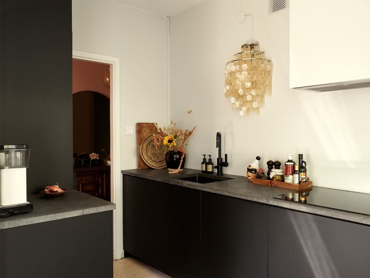 მისაღებ ოთახს უერთდება სამზარეულო, რომელიც თანამედროვე სტილშია გადაწყვეტილი და აქვს მქრქალი შავი ფერის აქცენტები.