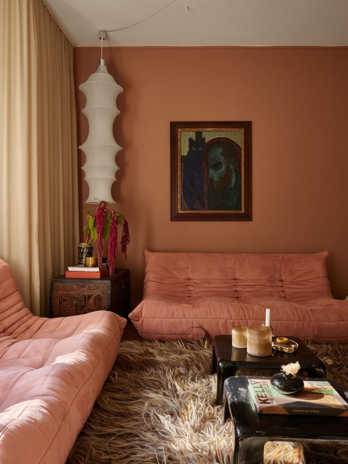 მისაღებ ოთახს ერთ მხარეს აქვს ღია ნაცრისფერი, ხოლო მეორე ნაწილში – თიხის ფერი კედლები, რომლებიც დაბალანსებულია თბილი, მოწითალო ფერებითა და აქცენტებით. სიმყუდროვის ეფექტის შესაქმნელად მეპატრონემ ხის იატაკი გამოიყენა, თუმცა იატაკს ემატება ვარდისფერი დივნები და მათთან შეხამებული ფარდებიც, რომლებიც მისაღებს საინტერესო ხასიათს სძენენ.