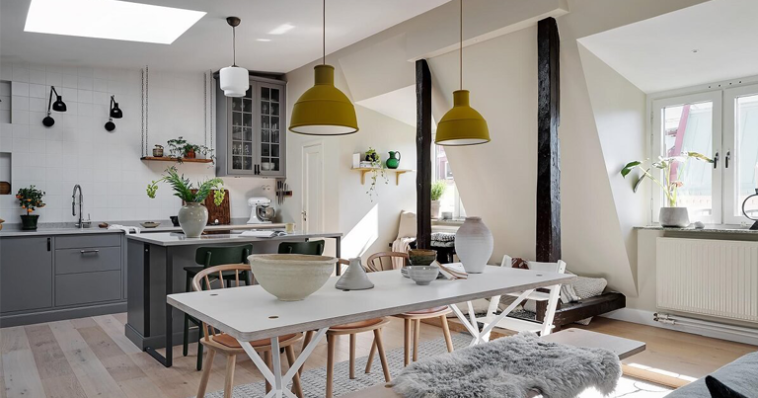 ეს მომხიბვლელი თანამედროვე ბინა ხის კოჭებითა და დახვეწილი ფერადი აქცენტებით სკანდინავიაში, გასული საუკუნის ბოლოს აშენებული საბინაო კომპლექსის ბოლო სართულზე მდებარეობს.