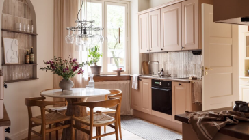 მისაღებთან არის გაერთიანებული სამზარეულოს ნაწილიც. მათ შორის განთავსებული სასადილო მაგიდა, ერთგვარად, გამყოფის როლს თამაშობს. სამზარეულო აღჭურვილია თანამედროვე ტექნიკითა და დეკორაციებით. აღსანიშნავია საინტერესო გარეგნობის მქონე ჭაღიც, რომელიც ნაცრისფერ ფერებს სასიამოვნოდ ეხამება. სკანდინავიურ ესთეტიკას ახასიათებს უხვი რაოდენობით მწვანე მცენარეების არსებობაც, რაც ამ სივრცეშიც იგრძნობა.