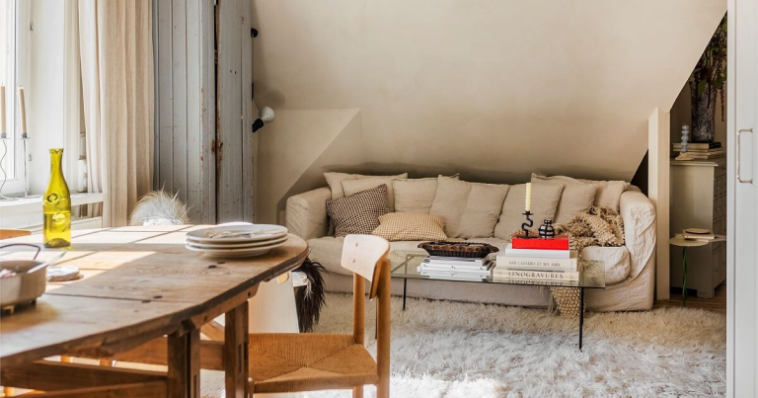 ეს საუცხოო ბინა სტოკჰოლმის ერთ-ერთ ყველაზე მომხიბვლელ ისტორიულ სახლში, სხვენის სართულზე მდებარეობს. მიუხედავად ამისა, სახლს მაღალი ჭერი აქვს.