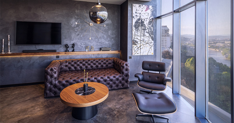 პროექტში გამოყენებული კიდევ ერთი მთავარი მასალა კაკლის ხის ავეჯია, რომელიც თითბერთან ერთად მდიდრულ ხასიათს აძლევს მთლიან ინტერიერს. ასევე გვხვდება ჩესტერის ტიპის ტახტი, რომელიც საქართველოშია დამზადებული.