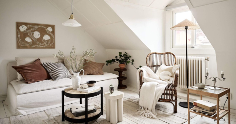 დახრილი კედლები ნებისმიერ ოთახს მეტ სიმყუდროვეს მატებს. შეიძლება ასეთი სივრცის გაფორმება ცოტა უფრო რთული იყოს, მაგრამ ეს პატარა სხვენის ბინა ნათელი მაგალითია იმისა, თუ რამდენად ლამაზად შეიძლება ასეთი დაგეგმარების მოწყობა.