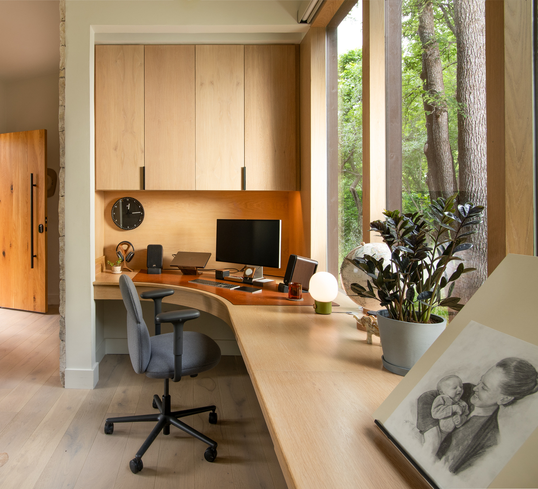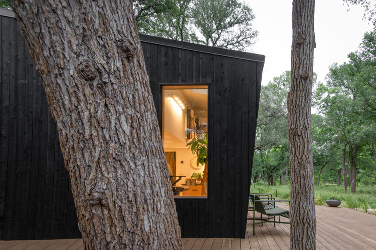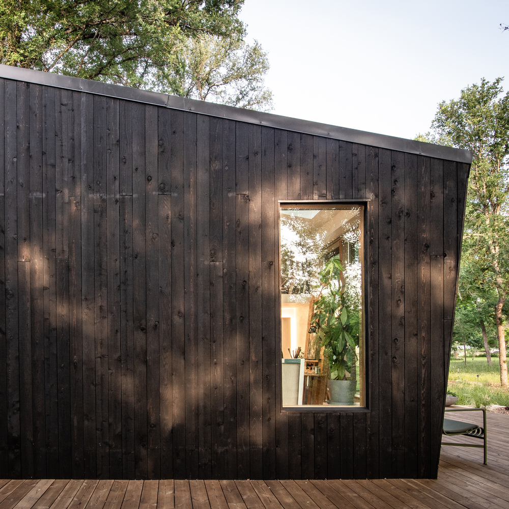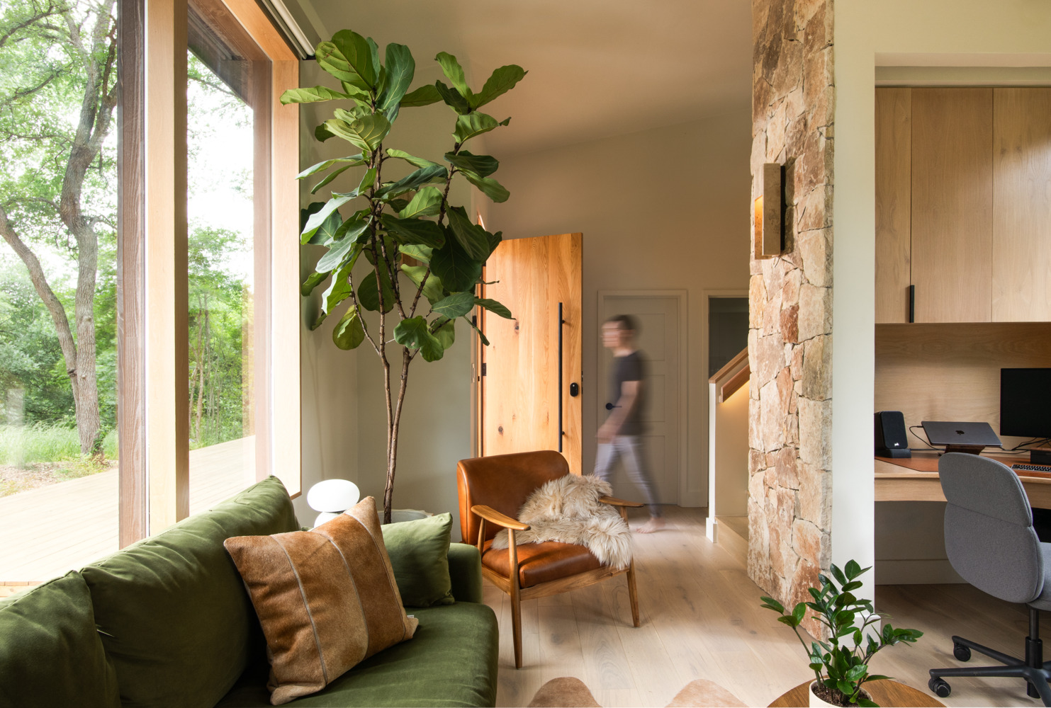 დიზაინი პატივს სცემს ბუნებას. მასალის სახით გამოყენებულია იაპონური კედრი, თეთრი მუხა, ადგილობრივი კირქვა და შუშა. საცხოვრებელი მდებარეობს ტყისა და ხეების უკანა ნაწილში. თითოეული დეტალი ზედმიწევნით არის შესწავლილი და შექმნილი ფუნქციონირებისთვის. ფორმებისა და სტრუქტურის გათვალისწინებით, სახლი მაქსიმალურად მყუდრო და კომფორტულია.
