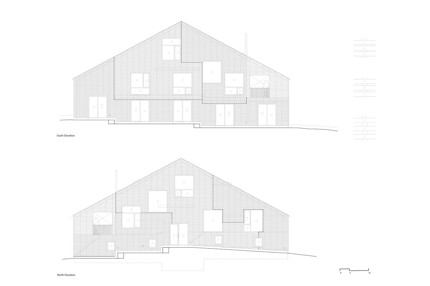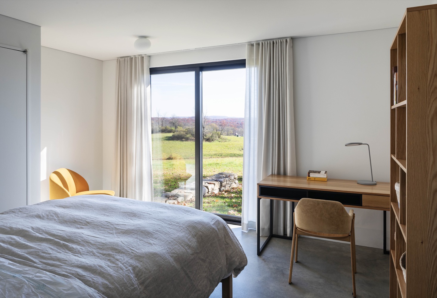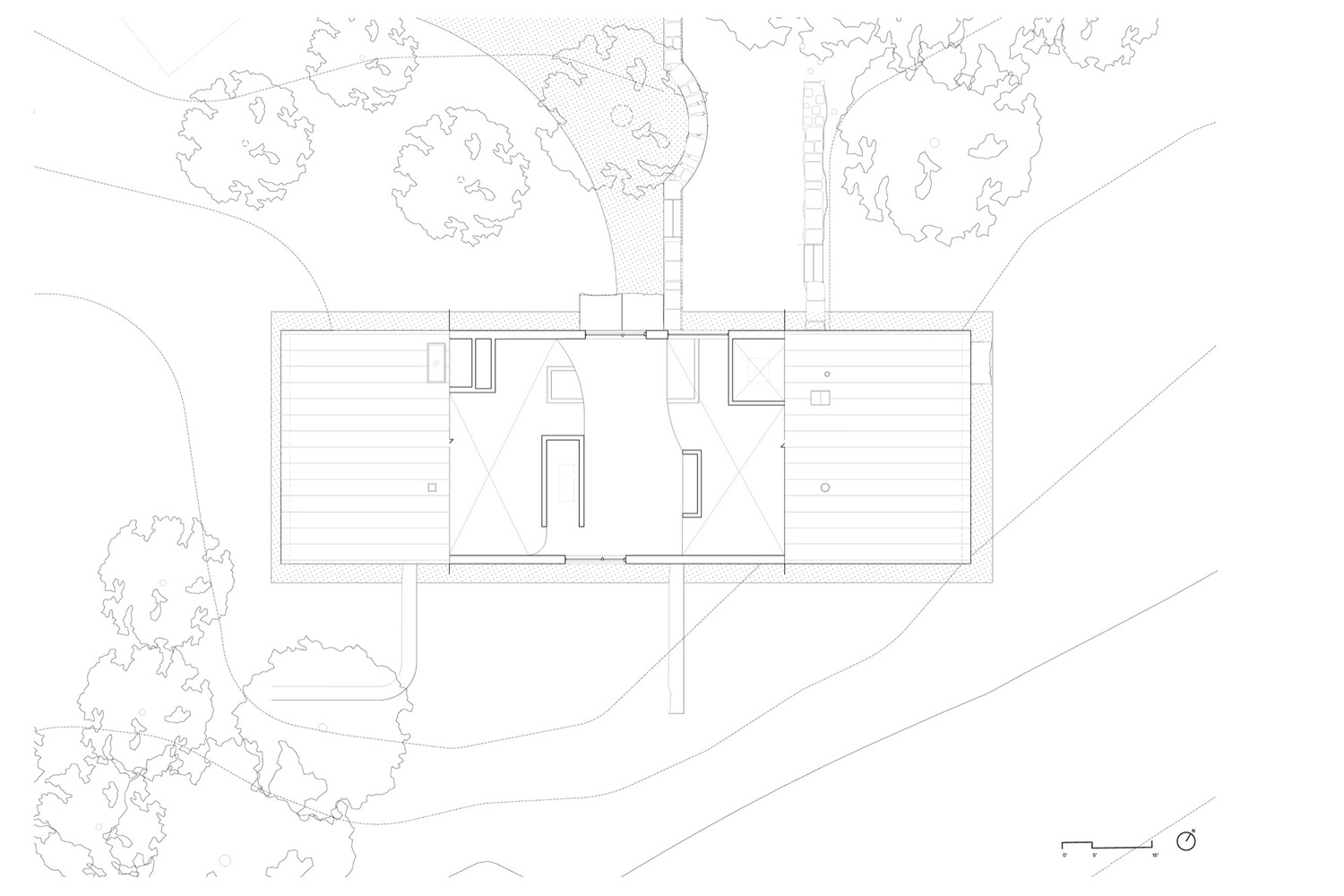 შენობას აქვს დიდი და თხელი ფანჯრები, კედლები ისეა დაპროექტებული, რომ ერთგვარ გამტარს ქმნის სახლსა და გარე სივრცეს შორის. ოჯახი, რომელიც ამ სახლში ცხოვრობს, ყოველდღიურ კონტაქტში შედის მიწასთან, ტყესთან და მის გარშემო სეზონების მიხედვით ცვალებად ბორცვებთან.