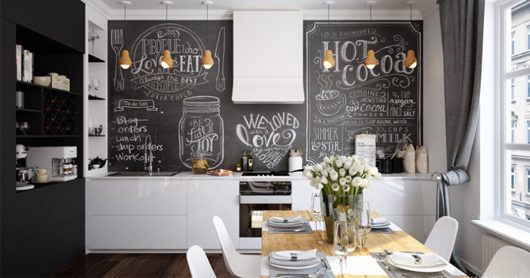 სამზარეულოს კედლის ცარცის საღებავით შეღებვა როგორც სახალისო, ასევე ფუნქციონალურია. ეს იდეალური ადგილია ოჯახის წევრებისთვის წერილობითი შეტყობინებების დასატოვებლად, საყიდლების სიის დასაწერად – ძალიან მოსახერხებელია დატვირთული გრაფიკის მქონე ოჯახისთვის.