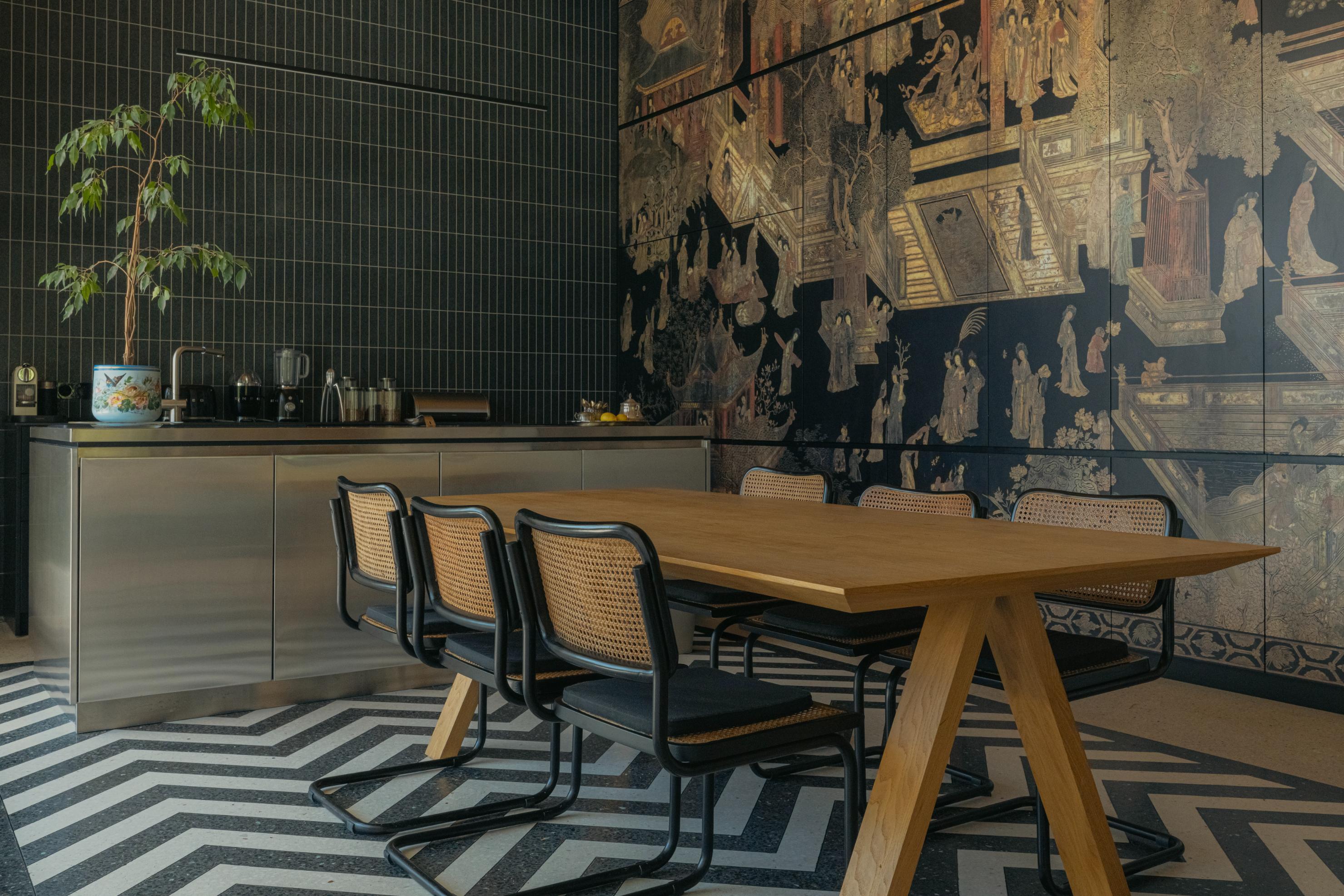 პირველი პროექტი გამოირჩევა თამამი ესთეტიკითა და ძლიერი ვიზუალური აქცენტებით. უჟანგავი ფოლადის კარადები და სამუშაო ზედაპირი შერწყმულია მუქ კედლის მოზაიკასთან და დეკორატიულ პანოსთან, რაც სივრცეს არტისტულ ხასიათს ანიჭებს. ხის მასიური მაგიდა და რეტრო სტილის სკამები არბილებს მეტალის “ცივ ხასიათს” და ქმნის მყუდრო, თუმცა ამავდროულად თანამედროვე ატმოსფეროს.