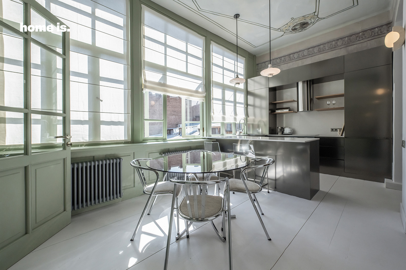 მეხუთე პროექტი განსაკუთრებული სინათლითა და სივრცის არქიტექტურულ კონტექსტთან ურთიერთობით გამოირჩევა. დიდი ფანჯრები, ღია ფერის იატაკი და მსუბუქი ავეჯი ქმნის ნათელ და ჰაეროვან გარემოს, სადაც უჟანგავი ფოლადის სამზარეულო ორგანულად ერწყმის ისტორიულ ინტერიერს და მსუბუქად ეხმიანება სივრცის საერთო ესთეტიკას.
