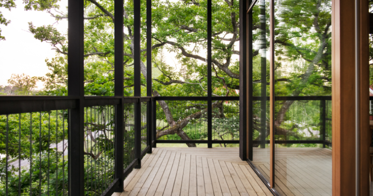 აქ გაშენებული ბაღი მოგაგონებთ იაპონურ კლდოვან ბაღს თავისი წვრილი ხრეშითა და გამოკვეთილი კლდეებით. სახლის უფრო პრივატული ოთახები შენობის აღმოსავლეთ ნაწილშია განლაგებული, ხოლო საცხოვრებელი ფართი და სამზარეულო – სხვა, უფრო დიდ მოცულობაში, რომლიდანაც ხედი როგორც ბაღისკენ ასევე, წყლისკენ იშლება.