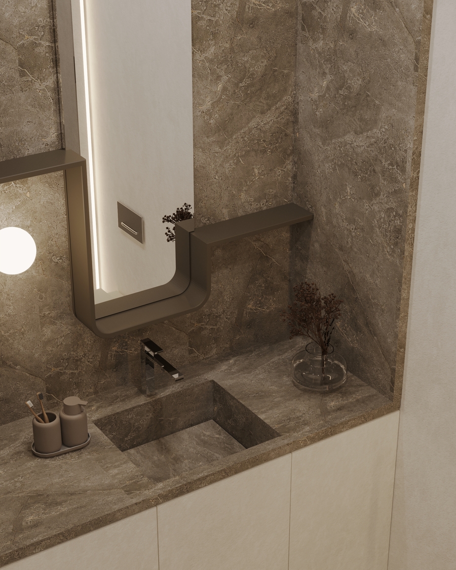 დერეფანში კარადებზე სარკეა დატანილი, რამაც ერთი შეხედვით ვიწრო სივრცეს მოცულობა შესძინა. მცირე და აქცენტირებული მასალების გამოყენებამ კი მინიმალურად დატვირთული ოთახი შექმნა.